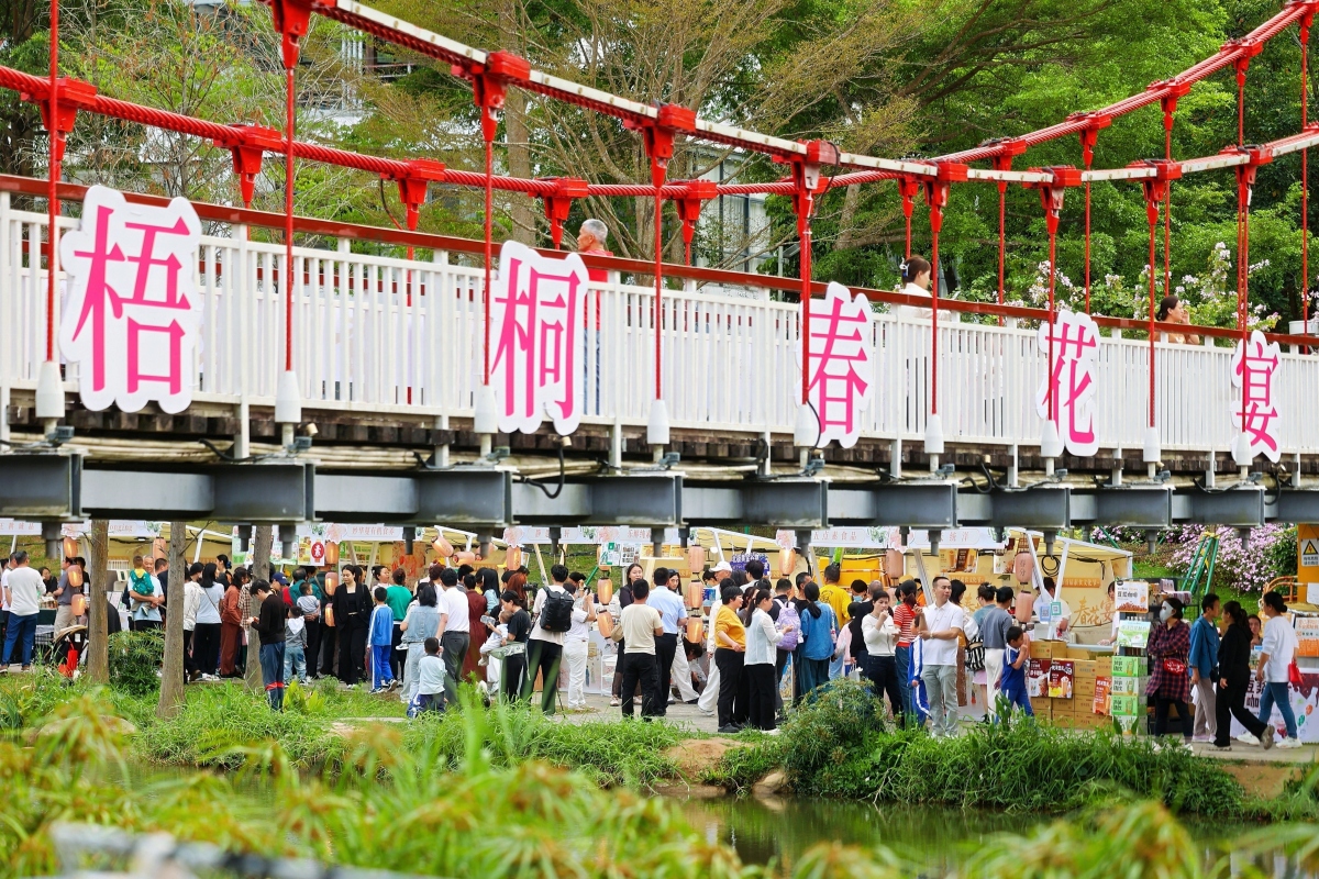 【點新聞報道】春日踏青正當時,深圳市首屆大梧桐春花宴近日在羅湖區望桐露營地、梧桐山河碧道詩意啟幕。步入梧桐山河碧道,宮粉紫荊沿河盛放,與遠處梧桐山上的毛棉杜鵑遙相呼應。碧道一側,「梧桐健康飲食街」與「梧桐藝術文化街」熱鬧開市,素食市集上,精緻的素食點心、創意素食引人駐足;沿河而行,民樂悠揚,古風舞蹈翩然上演,宋韻巡遊隊伍穿行其間,為春日山野增添了幾分古雅意趣……本次活動以花為媒、以素會友,推出千人素食長桌宴開席、直升機低空花遊雲端賞花、碧道露營、春日市集、文化展演一站式打卡活動,打造沉浸式春日文旅盛宴,吸引不少港人前往。