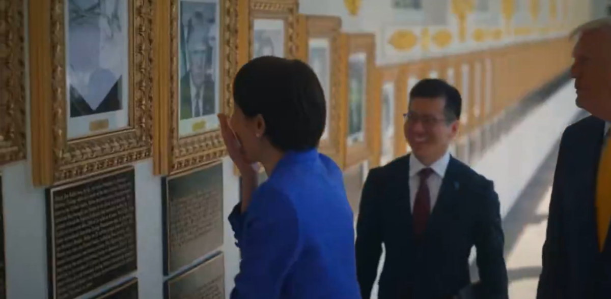 此外,在白宮發布的視頻中,其中一幕引起了美國網友的議論。片段顯示,在參觀白宮的肖像牆時,高市早苗對美國前總統拜登的「照片」捂嘴笑。在該照片的位置,美國總統特朗普以自動簽名筆的照片替換了拜登的肖像照。而在看到拜登的「照片」前,高市早苗對特朗普的照片反應積極,表示出推崇與尊重。