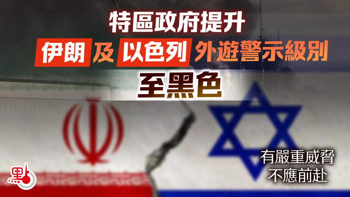 【點新聞報道】鑒於中東地區局勢持續惡化,香港特別行政區政府今日(23日)提升伊朗及以色列的外遊警示級別至黑色,並向巴林、約旦、阿曼、卡塔爾、沙特阿拉伯及阿拉伯聯合酋長國(阿聯酋)等中東國家發出黃色外遊警示。