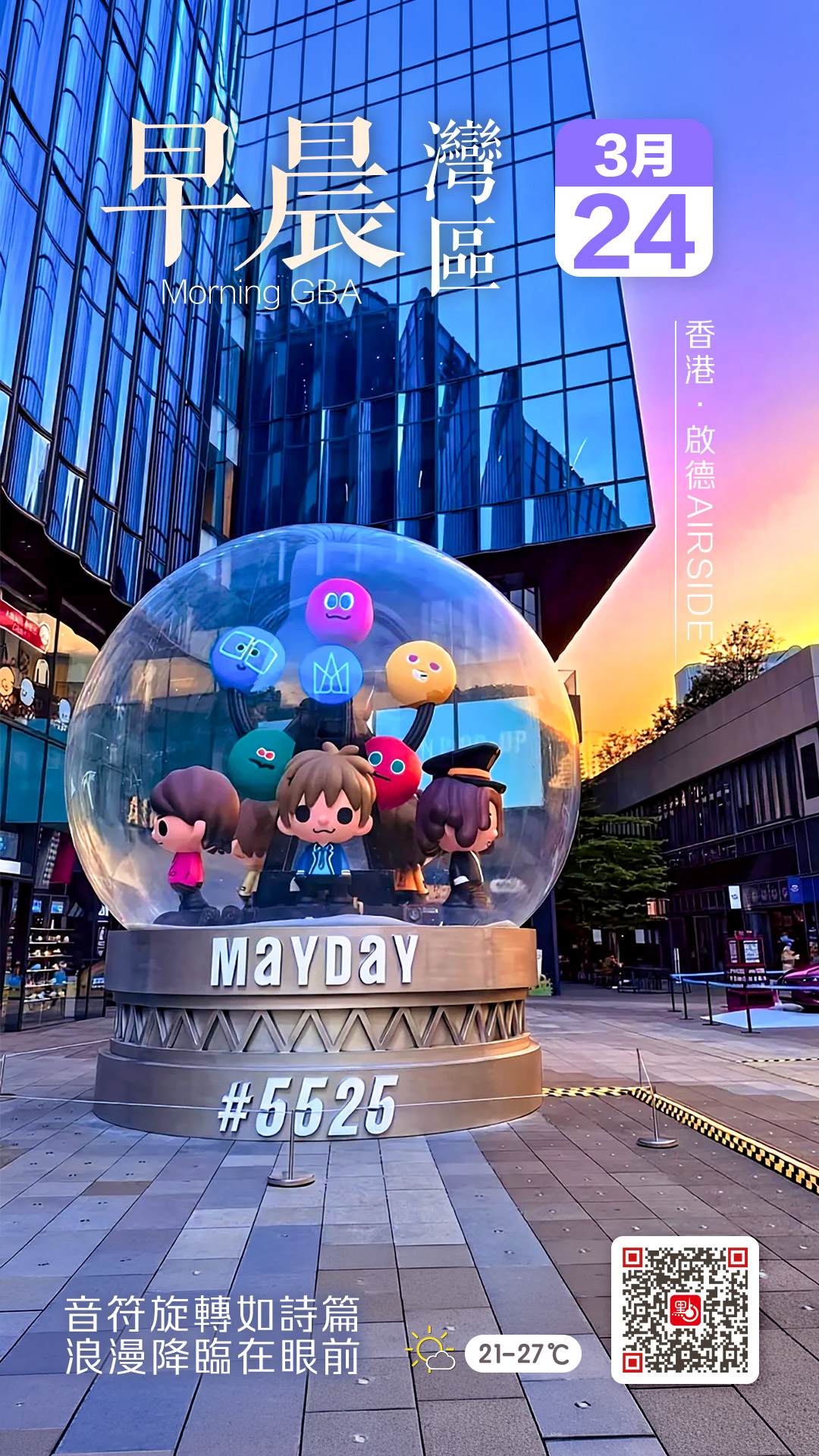 隨着演唱會臨近,啟德一帶已瀰漫濃厚的「五月天」氛圍。位於啟德AIRSIDE門外的巨型水晶球裝置已正式亮相,伴隨經典曲目的音樂盒旋律,在夕陽下緩緩旋轉,浪漫景象吸引大批歌迷駐足打卡,成為近期熱門景點。