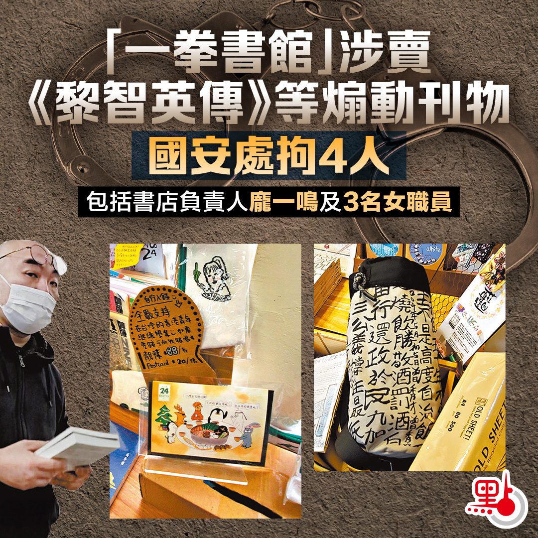 【點新聞報道】深水埗書店「一拳書館」疑持續售賣具有煽動意圖的書刊,香港警務處國家安全處今日(24日)拘捕4名男女,涉嫌違反《維護國家安全條例》第24條「明知而出售具煽動意圖的刊物」罪,並於現場檢取一批涉案的具煽動意圖的書籍。據了解,被捕人士包括書店負責人龐一鳴及3名女職員。