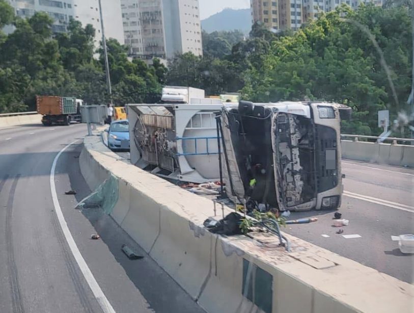 現場所見貨車橫亘在快線上,車頭擋風玻璃爆裂飛脫;私家車車頂變形。意外原因有待調查。
