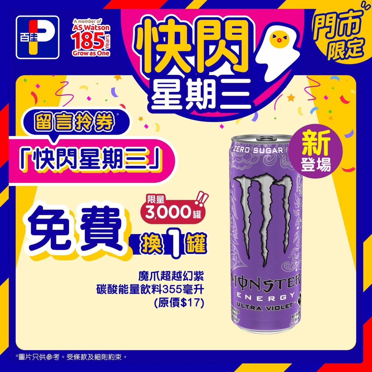 【點新聞報道】香港百佳超級市場今日(25日)快閃星期三有新登場的魔爪超越幻紫碳酸能量飲料。立即留言拎券,買任何產品即可以免費換走1罐魔爪超越幻紫碳酸能量飲料355毫升(原價$17/罐),限量3000罐。
