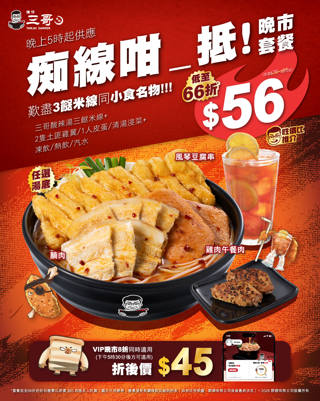 【點新聞報道】譚仔三哥推出全新「痴線咁_抵晚市套餐」,有風琴豆腐串、腩肉、雞肉午餐肉,加上招牌三哥酸辣湯底,還包小食(2隻土匪雞翼/1人皮蛋/清湯浸菜)同飲品,套餐價只需$56,用VIP晚市8折後更是$45。