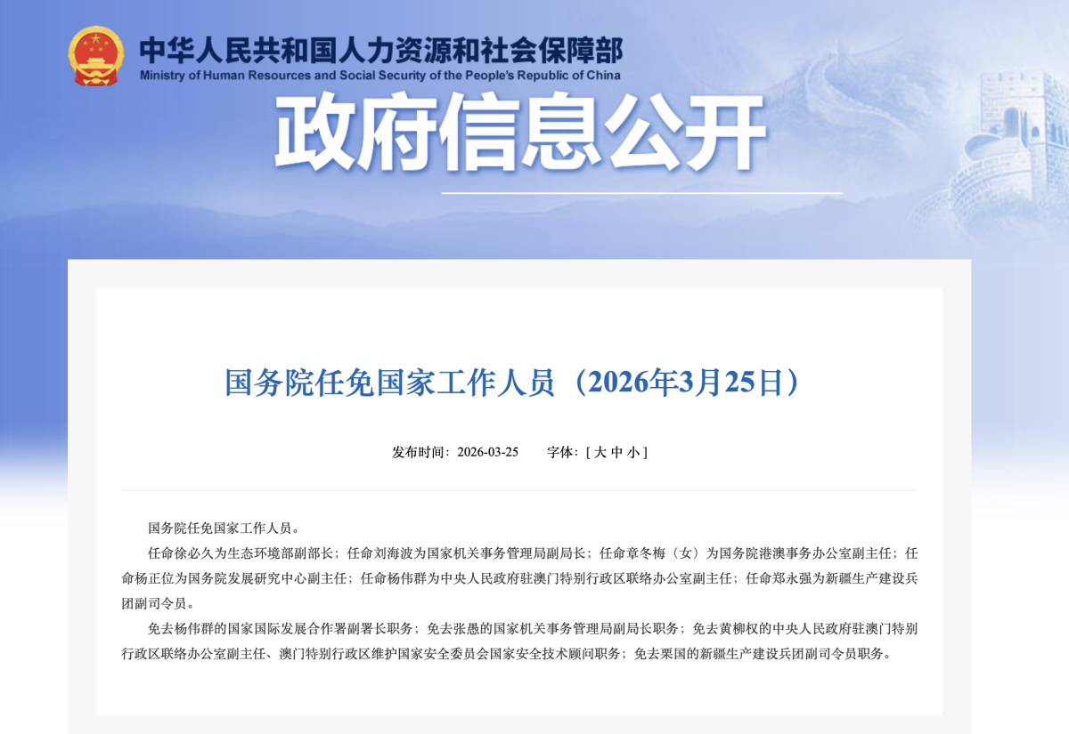 【點新聞報道】據人社部網站3月25日消息,國務院任免國家工作人員。任命徐必久為生態環境部副部長;任命劉海波為國家機關事務管理局副局長;任命章冬梅(女)為國務院港澳事務辦公室副主任;任命楊正位為國務院發展研究中心副主任;任命楊偉群為中央人民政府駐澳門特別行政區聯絡辦公室副主任;任命鄭永強為新疆生產建設兵團副司令員。