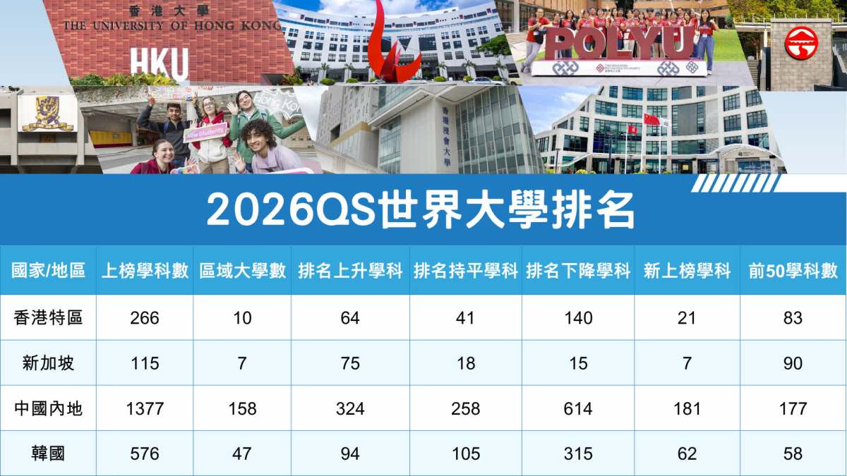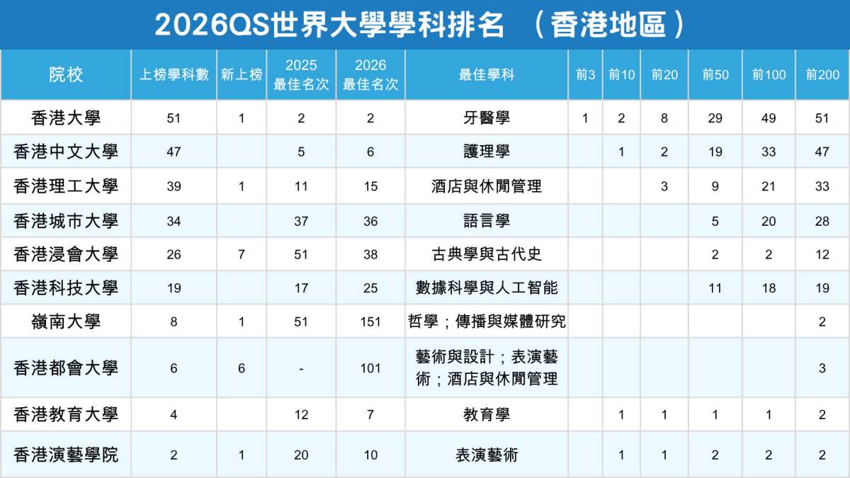 【點新聞報道】特區政府近年積極鞏固香港國際教育樞紐的地位,本港專上院校在國際排名屢創佳績。國際高等教育機構QS今日(25日)公布2026年世界大學學科排名,香港整體表現亮眼:本港今年有5個學科躋身全球首10位,較去年少1科。其中,港大牙醫學繼續排名最高,位列全球第2。演藝學院的表演藝術躍升10位,排名第10位,為首次打入首10位。