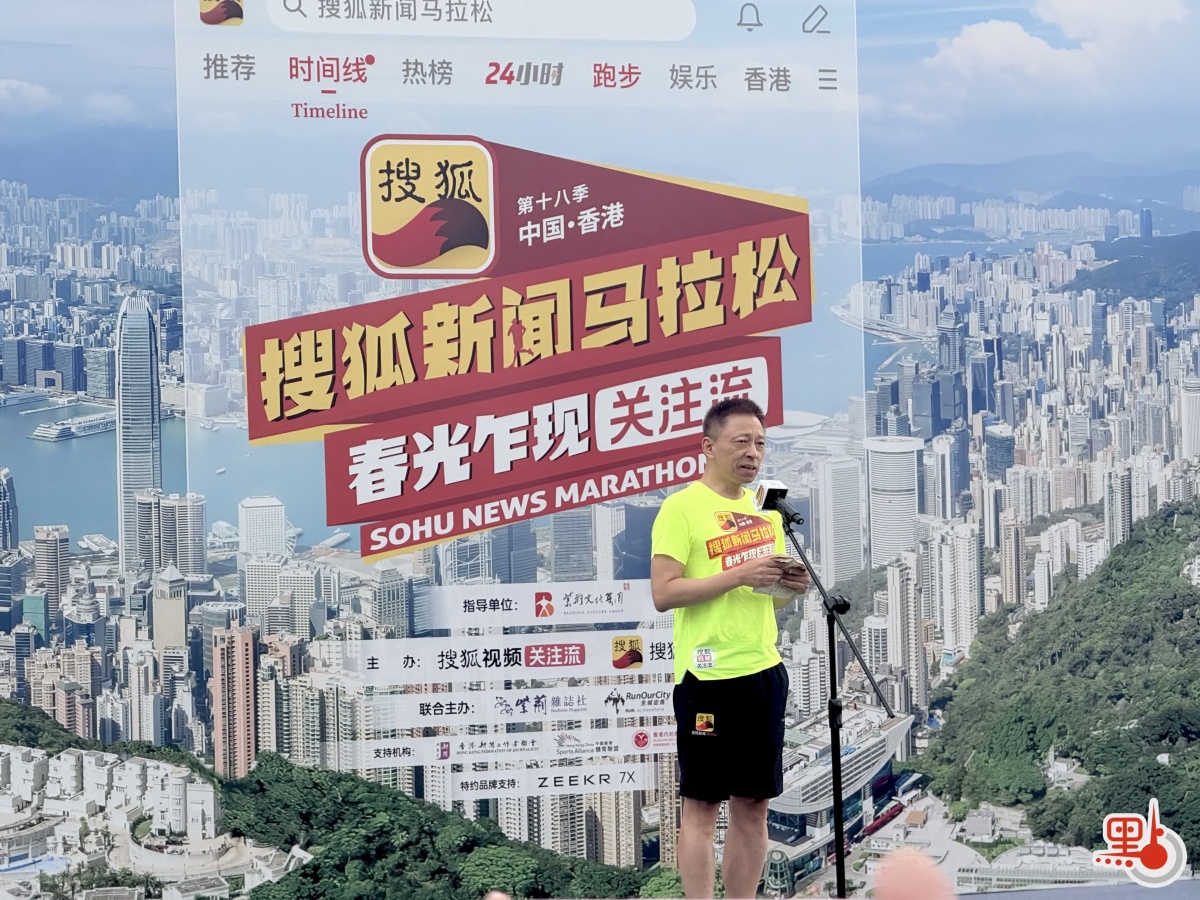 搜狐創始人、董事局主席兼首席執行官張朝陽致辭時讚香港是運動天堂,因為這裏不僅有繁華都市,還有山路、台階和美麗海灣風光,能帶來豐富的運動體驗。張朝陽指,本周搜狐平台聚焦香港,希望能透過馬拉松活動推介這座城市,讓更多網民來港遊玩。