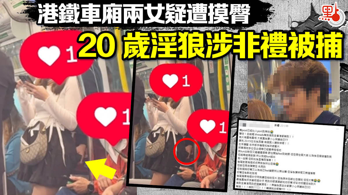 網上社交平台threads日前流傳一則帖子並且附上影片及圖片,稱自己在22日晚上乘搭港鐵屯馬綫期間,遭一名男子非禮,「警世!全能嘅threads幫我推到全香港都睇到!!有片有圖有真相,大家真係要小心保護自己,頭先23:15左右係西鐵,有個男人摷我條裙!! 左手摷緊,右手部手機唔知係咪錄緊片,架車廂咁多位佢企埋嚟已經覺得怪怪地,我tun出啲佢又繼續逼埋嚟,跟住開始feel到啲野,但佢揹住個大袋,以為係佢個袋撞到我,但越嚟越唔對路,所以我越tun越出,我一走開,佢即刻係荃灣西落車!! 後尾對面有個叔叔問我係咪比佢搞,佢話佢見我彈開佢先見到,但我個時好驚又以為自己feel錯野所以無出聲,佢淨係摷條裙又無揸落嚟,好驚佢係影咗我相,後尾落車有個女仔同我講佢拍咗佢片,因為原來佢都比佢摸咗,但佢太驚最後真係好多謝呢個女仔,見到你眼濕濕都知你好驚,好彩你好醒目拍到片,推到全香港見到呢個鹹濕佬!!無論係男定女都要小心保護自己,幫推!!!推到X街!!!轉頭就去報警!!!!!」