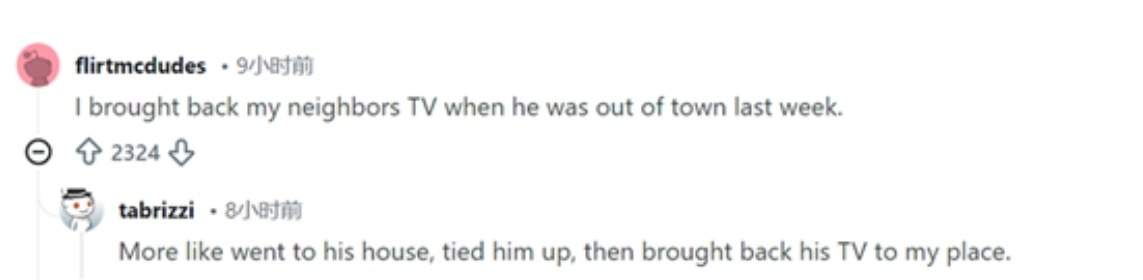更有網友形容,這就像「上周鄰居外出的時候,我把他家電視搬回來了。」有網友回覆,應該「更像是去了他家,把他綁起來,然後把他家電視搬回了我家。」 ↓