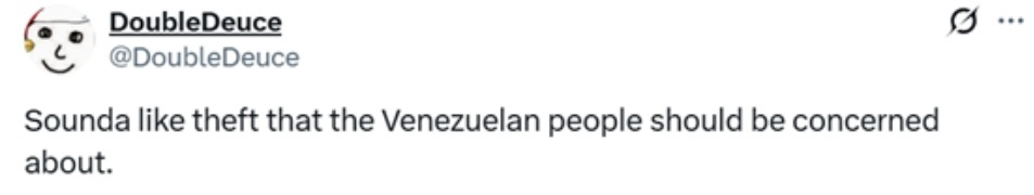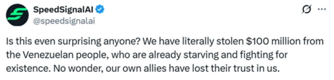 「難道會有任何人對此感到意外嗎?我們確實從委內瑞拉民眾手中竊走了1億美元,而這些人本就在挨餓並為生存掙扎。難怪連我們自己的盟友都對我們喪失了信任。」 ↓