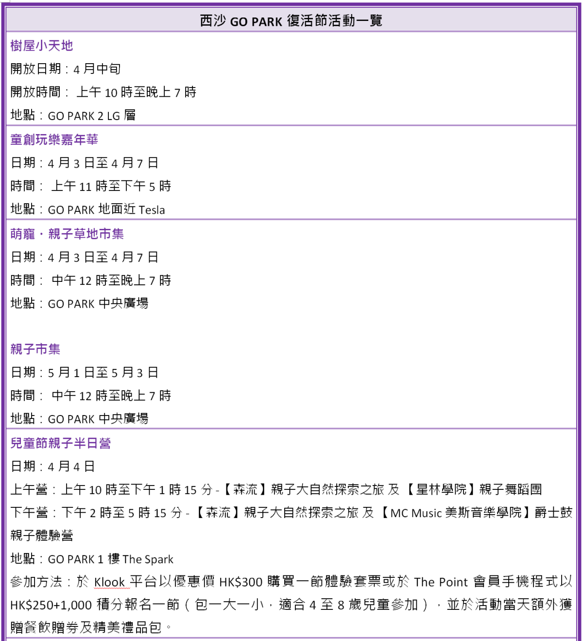 配合復活節假期,西沙GO PARK將設置充氣復活蛋遊戲區及打卡位,並舉辦童創玩樂節,包括童創玩樂嘉年華、推出報班優惠及送出商場贈券等。GO PARK將每月舉辦一次親子市集,首場市集於4月3日至7日舉行,主打人寵親子用品,結合GO PARK的寵物公園,讓一家大小與家中寵物共享天倫樂;5月市集則由小朋友擔任檔主,大家密切留意商場公布的招募詳情。