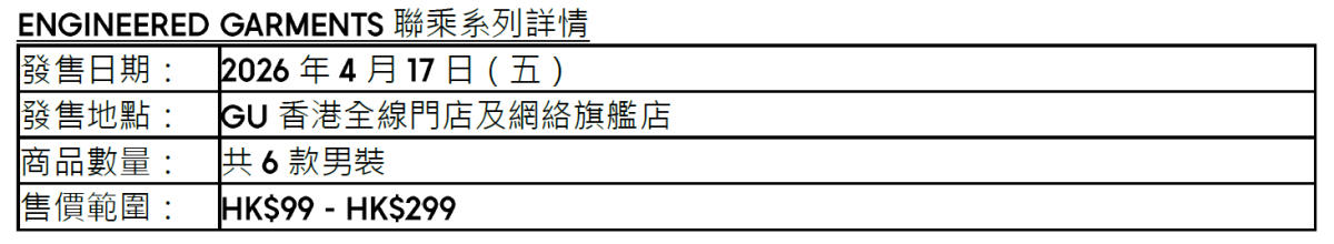 東京時尚品牌GU致力推廣「YOUR FREEDOM時尚自由·讓自己不一樣」的品牌訊息,現宣布即將與紐約時尚品牌ENGINEERED GARMENTS合作推出第二度聯乘系列。是次2026春夏系列商品將於4月17日起,於GU香港門店及網絡旗艦店同步發售。