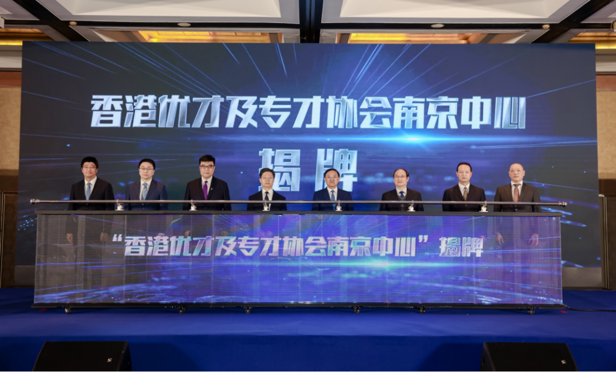 隨後,江蘇省人力資源和社會保障廳廳長朱從明,省委統戰部副部長李衛華,南京市司法局局長李鵬等人在全場見證下為「香港優才及專才協會南京中心」推桿揭牌,標誌着該中心正式落戶江蘇(南京)涉外法律服務中心。
