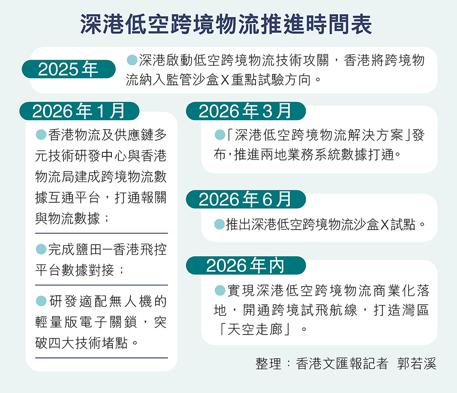 粵港澳大灣區低空經濟版圖再拓新局。昨日舉行的灣區東部低空經濟高質量發展大會上,「深港低空跨境物流解決方案」正式發布,香港物流及供應鏈多元技術研發中心(LSCM)、工信部電子五所賽寶低空通航實驗室聯合披露關鍵進展:雙方已完成跨境數據互通、飛控平台對接等核心突破,計劃於2026年6月推出深港低空跨境物流監管沙盒試點,推進跨境試飛與航線申報演示,期待能共同攜手打造安全高效、規則互通的粵港澳大灣區「天空走廊」,助力深港建設全球低空經濟中心。