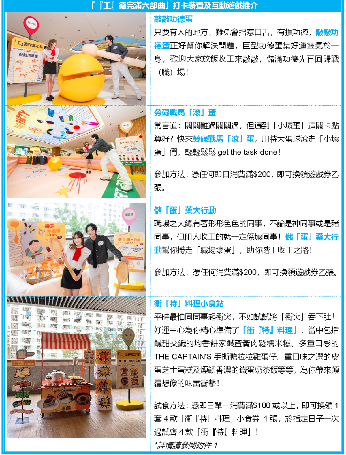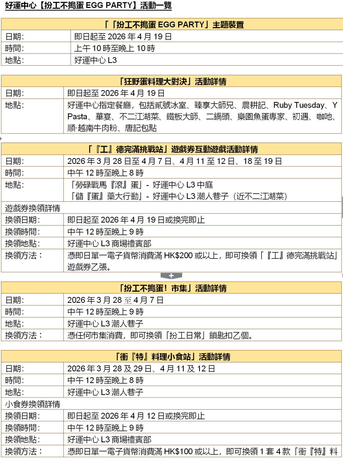 即日起至4月19日,好運中心號召全港社畜齊齊放低工作煩惱,舉辦「扮工不搗蛋EGG PARTY」,準備了全港首個「狂野蛋料理大對決」,以試蛋價嘆多款創意蛋系美食,亦特設「工」德完滿六部曲,集玩味打卡、特色市集於一身。返工有苦惱?現場更設有答案之書—office篇,解答一眾打工仔的疑難雜症,下一站為你送上衝「特」料理以及美食市集,為你搜羅一系列社畜comfort food!