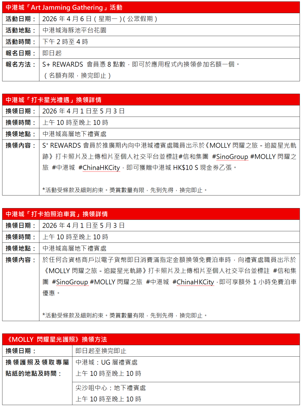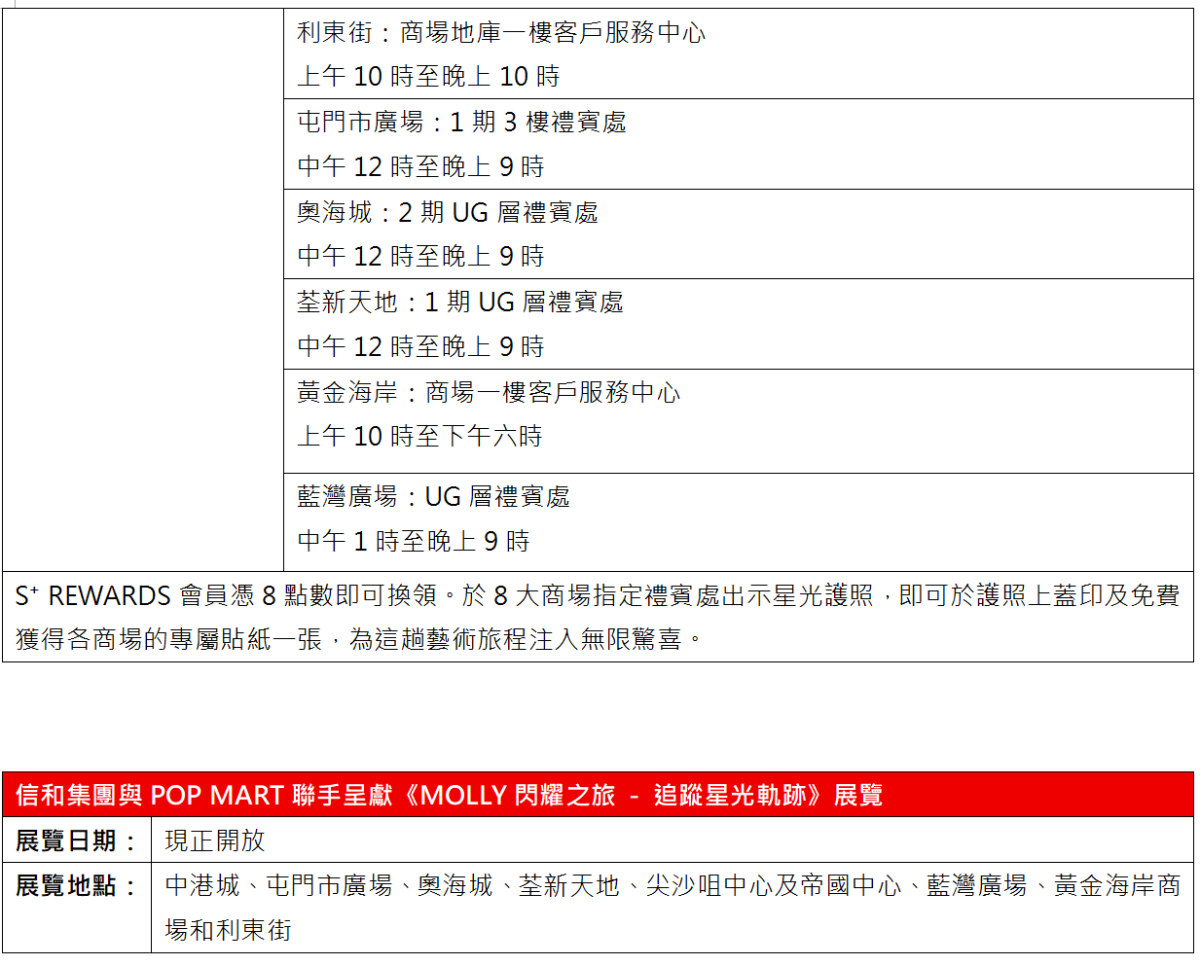 4月1日至5月3日,中港城更推出2大打卡禮遇,S⁺REWARDS會員只要與《MOLLY閃耀之旅—追蹤星光軌跡》中港城站展出的MOLLY雕像合照及上載至社交媒體,即可享中港城HK$10現金券及1小時額外免費泊車優惠,數量有限,換完即止。S⁺REWARDS會員憑8點數即可換領《MOLLY閃耀星光護照》,於8大商場指定禮賓處出示星光護照,即可於護照上蓋印及免費獲得專屬貼紙一張!