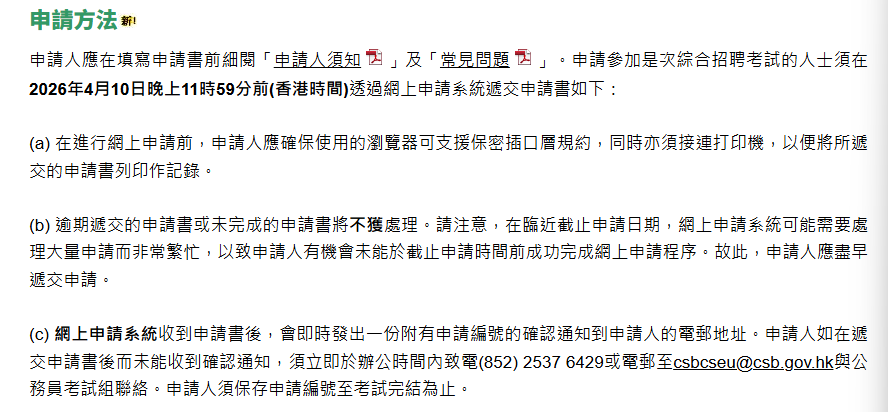 楊何蓓茵提醒有志進入政府公務員體系的考生,有意投考學位或專業程度公務員職位的人士必須具備有效的CRE成績。第二,政府已擴展投考需學士學位學歷要求公務員職位的資格至大學三年級(四年制學士學位課程)學生,換言之,2026年應屆大學畢業生、2027年大學畢業生,以及持有大學學位、符合職位所需的專業資格的人士,均可報考這輪CRE。