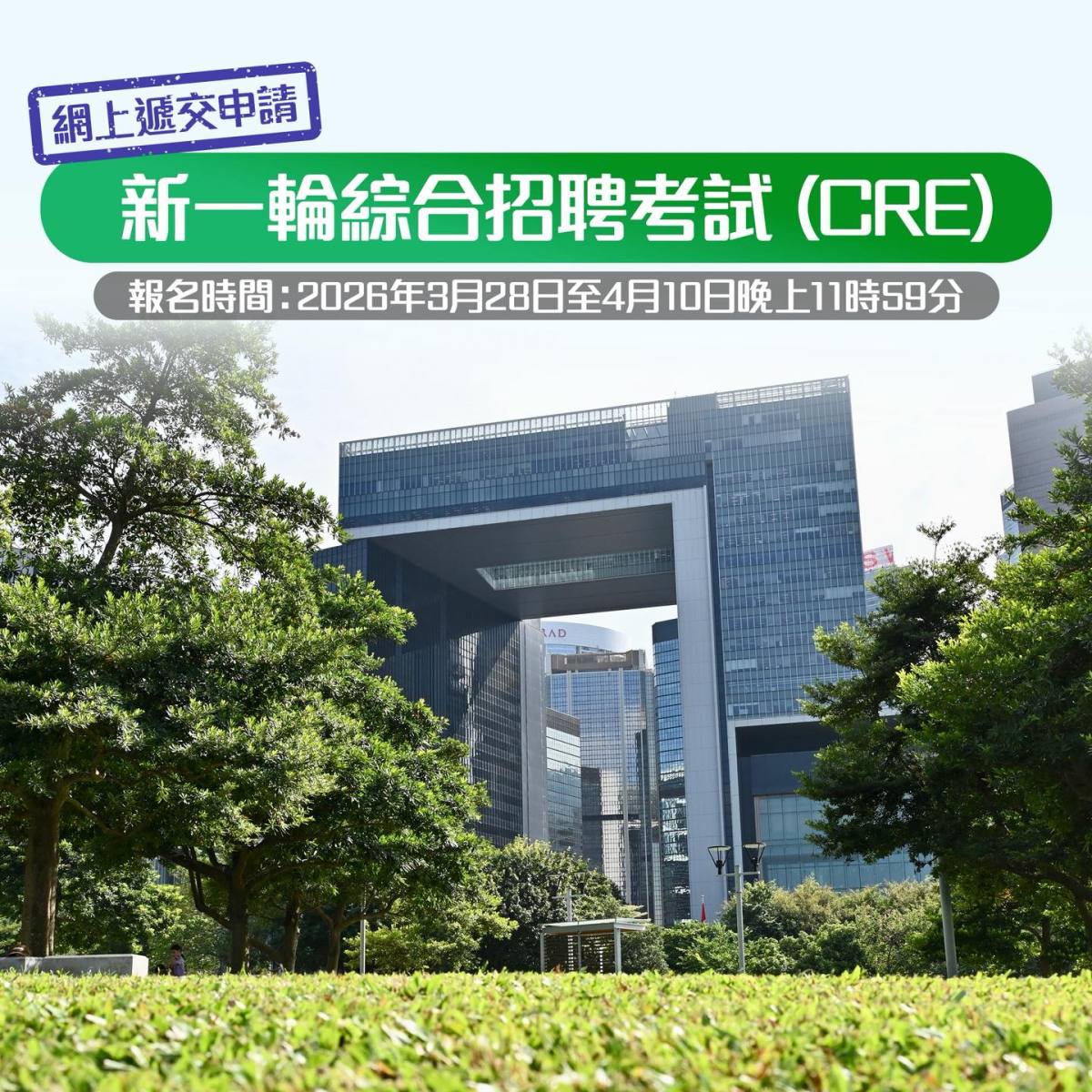 【點新聞報道】新一輪綜合招聘考試(CRE)今日(28日)起接受報名,考試時間暫定於6月6日。有關綜合招聘考試的詳情已上載至公務員事務局網頁,申請人須透過網頁上的申請系統報考。報名截止日期為4月10日。公務員事務局局長楊何蓓茵表示,鼓勵有志服務社會的人士,把握機會報考這輪CRE,及盡早報考數碼化BLNST,以取得加入公務員團隊的基本「入場券」。