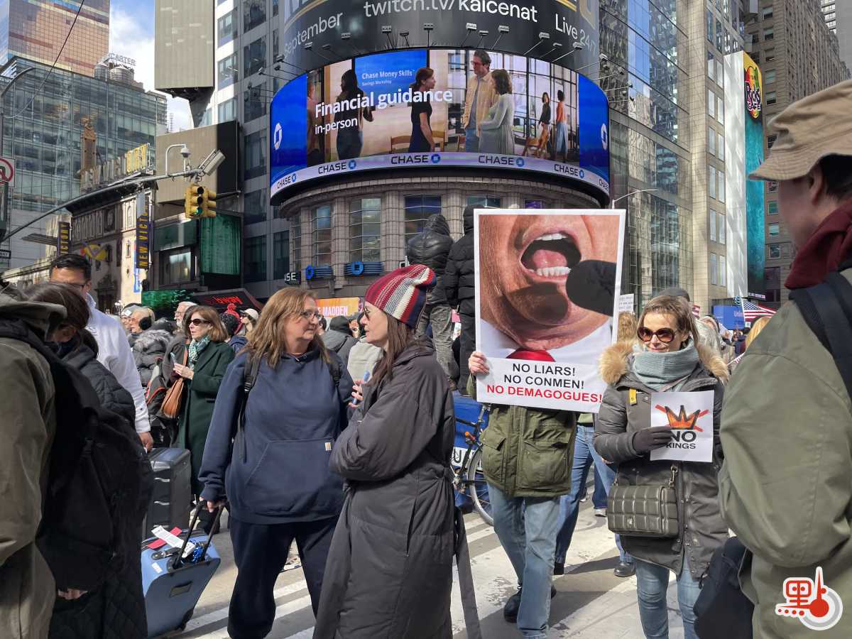 【點新聞報道】當地時間28日,全美各地爆發了超過3000場「不要國王」(No Kings)示威活動。紐約曼哈頓有數以萬計民眾上街,反對特朗普政府政策,表達對美國攻打伊朗、強硬移民執法的強烈抗議。活動組織者表示,本次反對特朗普活動以及註冊參與活動的人數激增,最少有800萬人參與,比去年6月及10月兩輪同類集會更多。