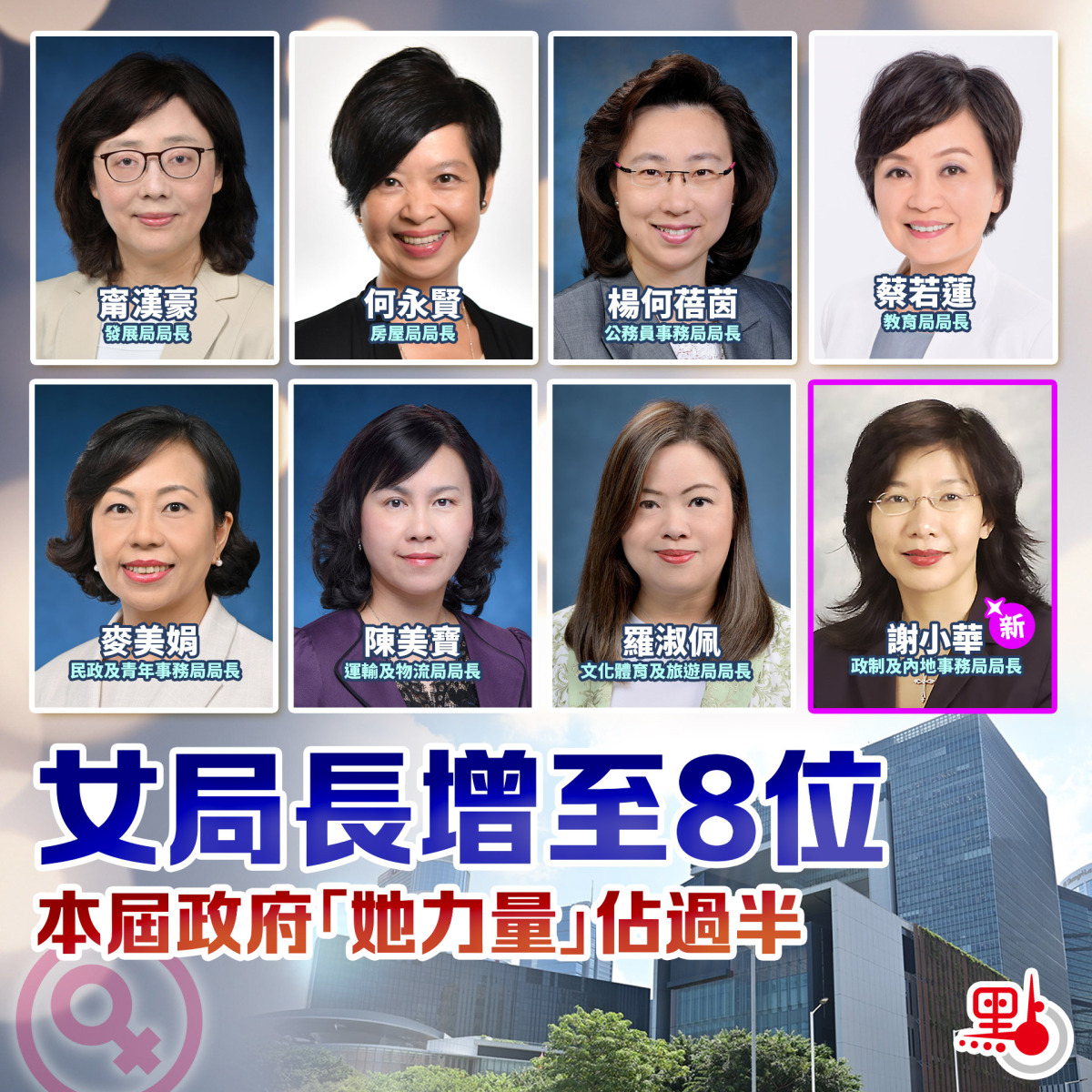 至此,本屆特區政府三司十五局有8位女性局長。除了今次出任政制及內地事務局局長的謝小華,還有發展局局長甯漢豪、房屋局局長何永賢、公務員事務局局長楊何蓓茵、教育局局長蔡若蓮、民政及青年事務局局長麥美娟、運輸及物流局局長陳美寶、文化體育及旅遊局局長羅淑佩。