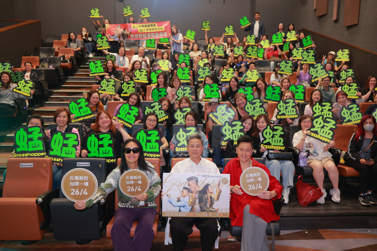 【點新聞報道】草蜢將於4月26日起,於紅館舉行七場「GRASSHOPPER THREE IN LOVE草蜢演唱會2026」,密鑼緊鼓閉關綵排之際,日前突擊尖沙咀一戲院,現身Fans包場睇之前「RE:GRASSHOPPER CONCERT 草蜢演唱會」Blu-ray聚會。與全場Fans在觀眾席一齊又唱又跳,揮動手燈、應援名牌和橫額,三小時足本播放,猶如置身草蜢專屬CantoPop Disco般震撼。草蜢更即場向Fans下「打Call密令」和Dress Code,約定月底紅館演唱會全場一齊玩。