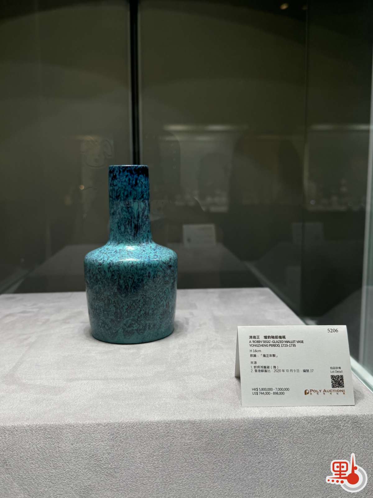 清雍正爐鈞釉紙槌瓶釉色藍紫交融,口沿下端可見紅色斑點,為雍正朝爐鈞釉器標誌性的「高粱紅」,器型借鑒北宋汝窯紙槌瓶,體現了雍正朝對宋代審美的崇尚,其簡約大氣的風格亦可適配現代家居。