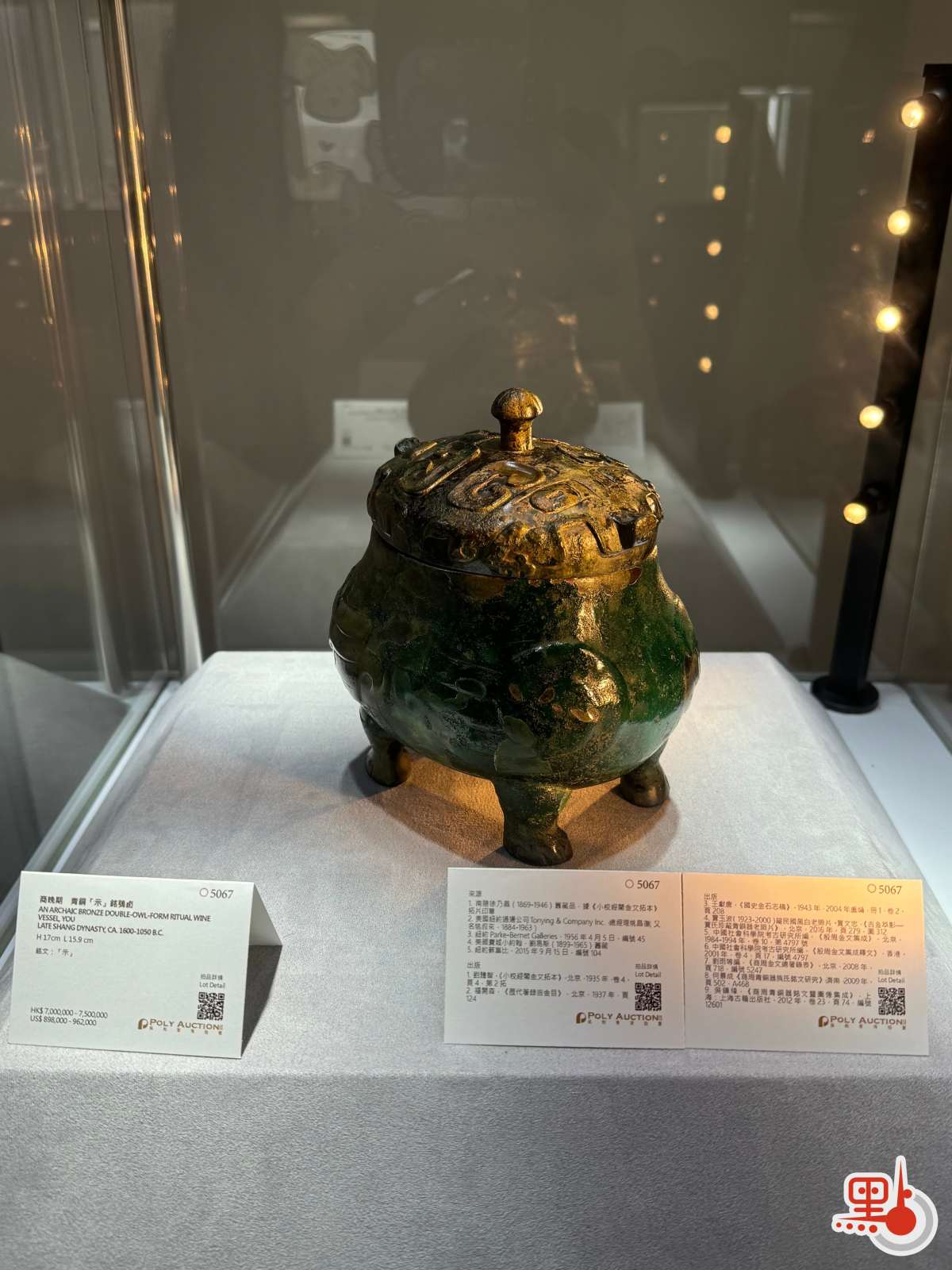 商晚期青銅「示」銘鴞卣用於祭祀盛酒,以兩隻貓頭鷹背靠背為造型,形態罕見。該藏品流傳有序、來源清晰,曾為徐乃昌(1869-1946)舊藏,並多次經權威出版着錄。