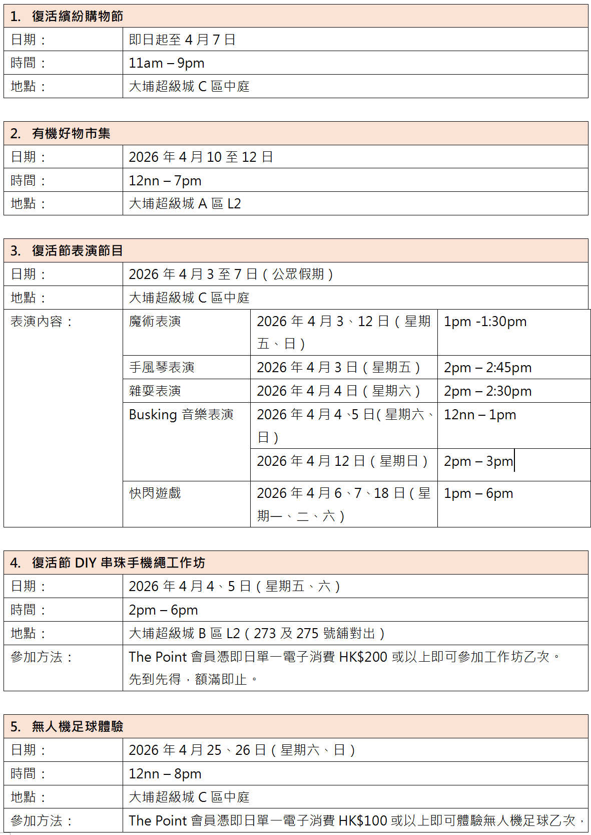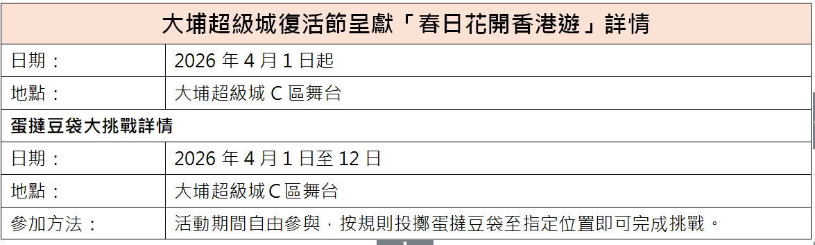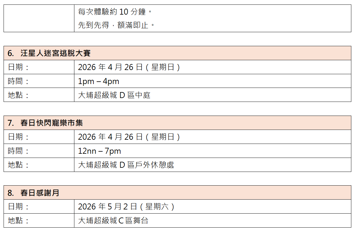 活動期間,大埔超級城將會舉行一系列多元化活動,橫跨3、4、5月整個春季!其中包括: