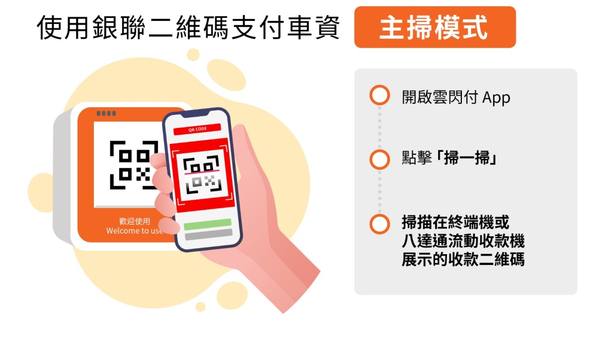• 掃描在終端機或八達通流動收款機展示的收款二維碼