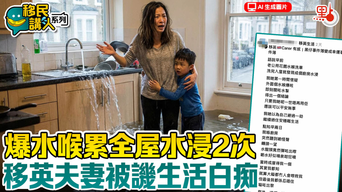 該名移英人妻在社交平台threads發文講述屋企爆水喉的慘況,「話說早前,老公用花園水喉洗車,洗完入屋就發現成個廚房水浸,我哋第一時間懷疑外面個水喉爆咗,即刻關咗水掣。得出一個結論只要我哋呢一世唔再用佢,應該可以平安無事。」一家人自以為避過一劫,繼續過住安穩生活。