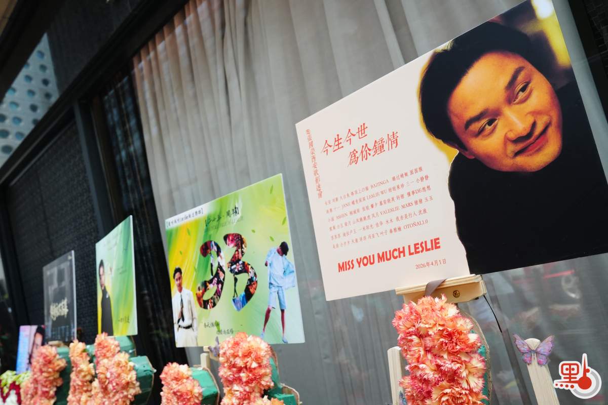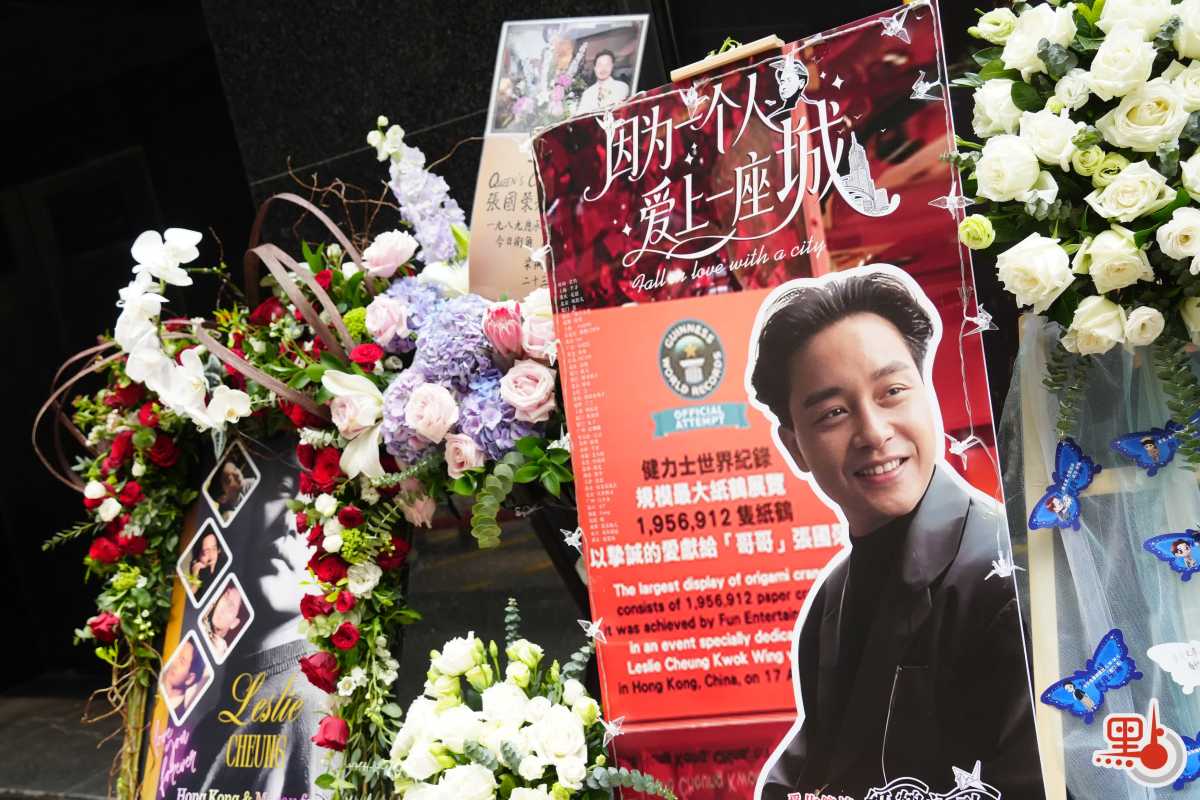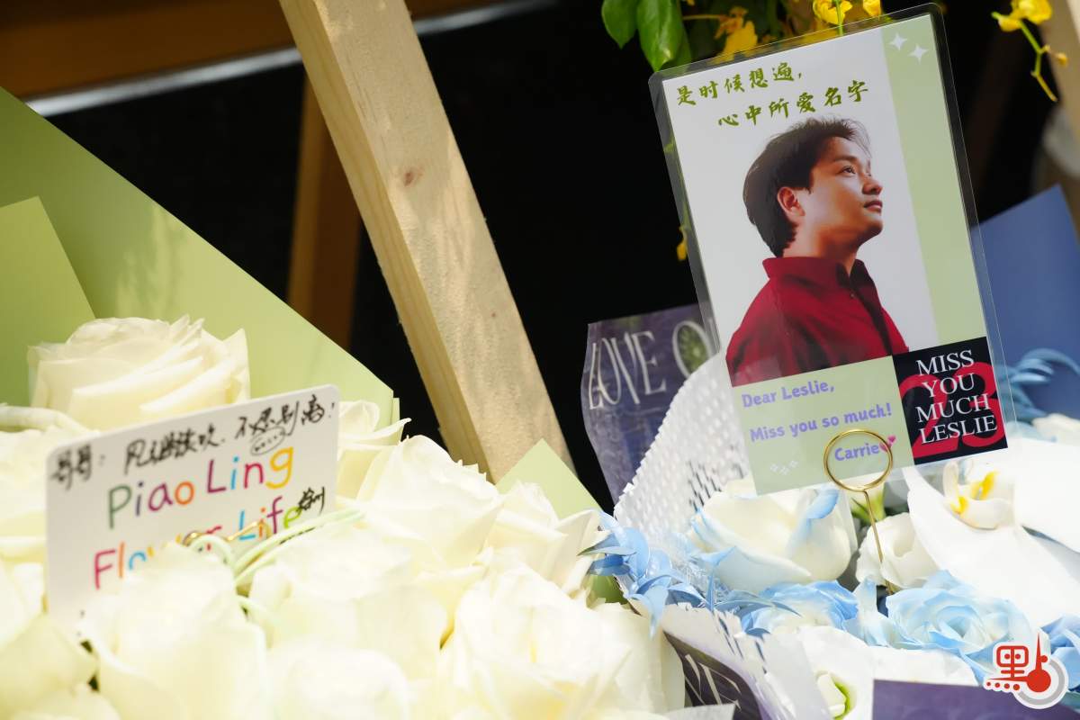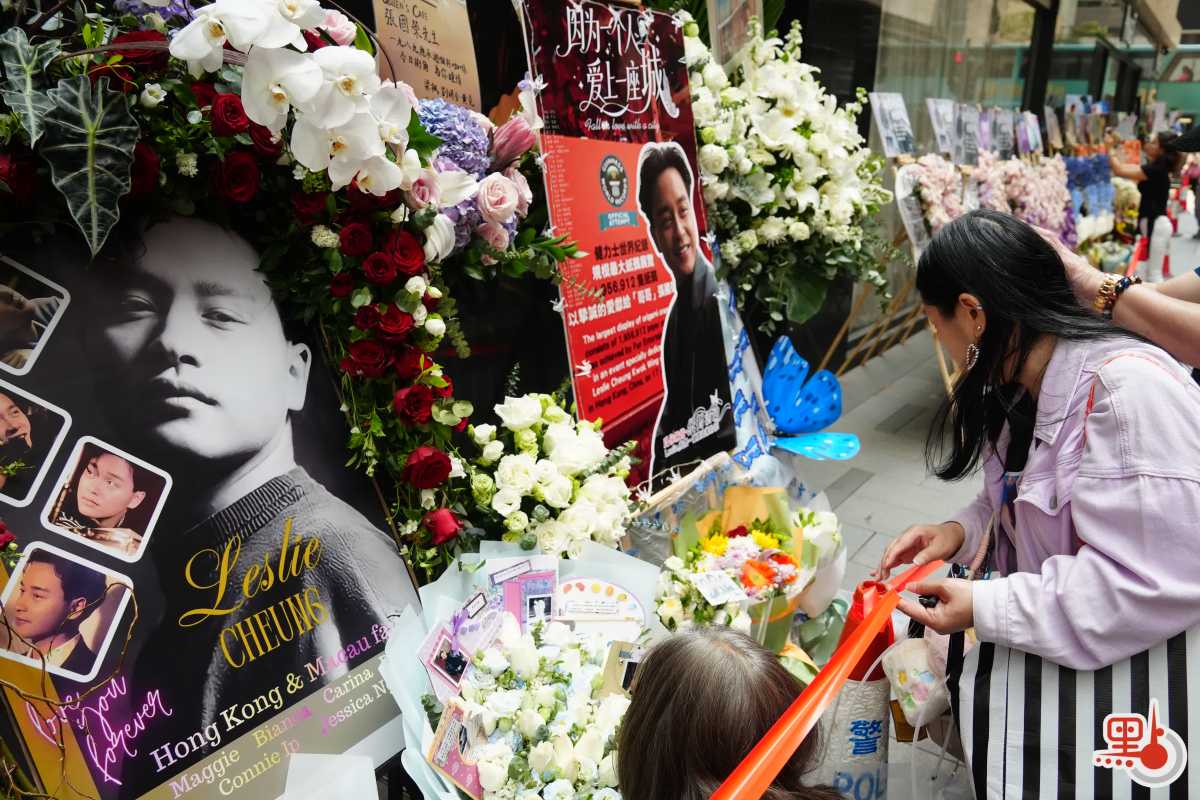 今日早上,文華東方酒店外的行人道擺滿鮮花、花牌和紀念展板,當中包括以紅白玫瑰製成的排字,寫着「愛慕哥哥」、「此愛綿綿無絕期」等標語。許多粉絲特地從世界各地遠道而來,參與這場悼念活動並獻上花束。點新聞記者留意到,「哥迷」精心準備的心意卡當中,還印有「哥哥」參加麗的電視「亞洲歌唱大賽」時翻唱《American Pie》的相片,象徵張國榮歌唱事業的開始。