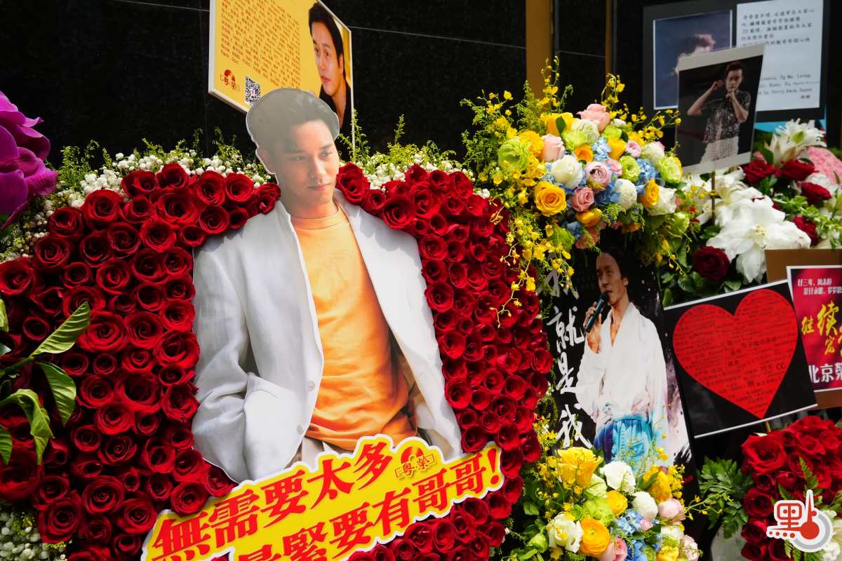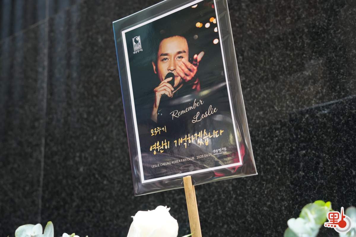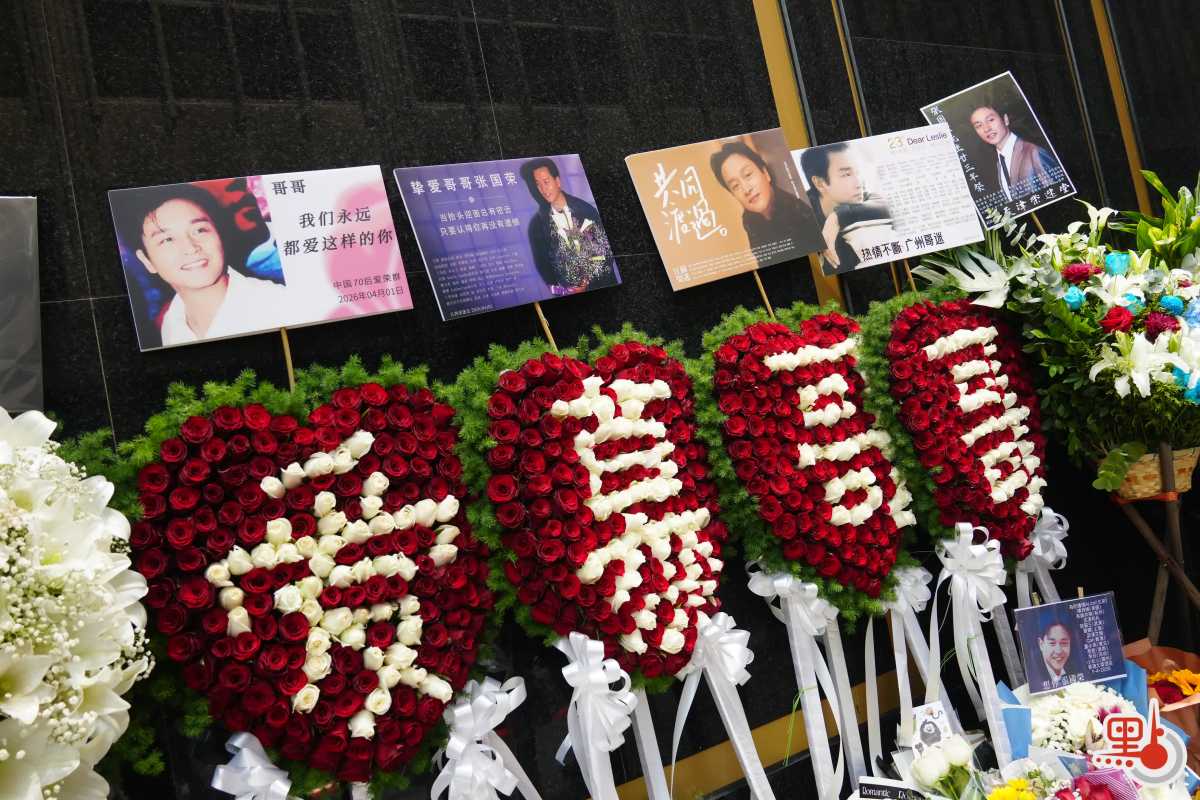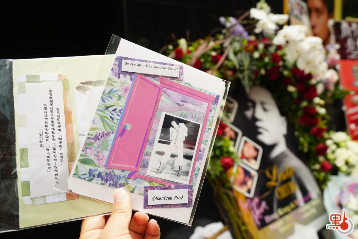 今日早上,文華東方酒店外的行人道擺滿鮮花、花牌和紀念展板,當中包括以紅白玫瑰製成的排字,寫着「愛慕哥哥」、「此愛綿綿無絕期」等標語。許多粉絲特地從世界各地遠道而來,參與這場悼念活動並獻上花束。點新聞記者留意到,「哥迷」精心準備的心意卡當中,還印有「哥哥」參加麗的電視「亞洲歌唱大賽」時翻唱《American Pie》的相片,象徵張國榮歌唱事業的開始。