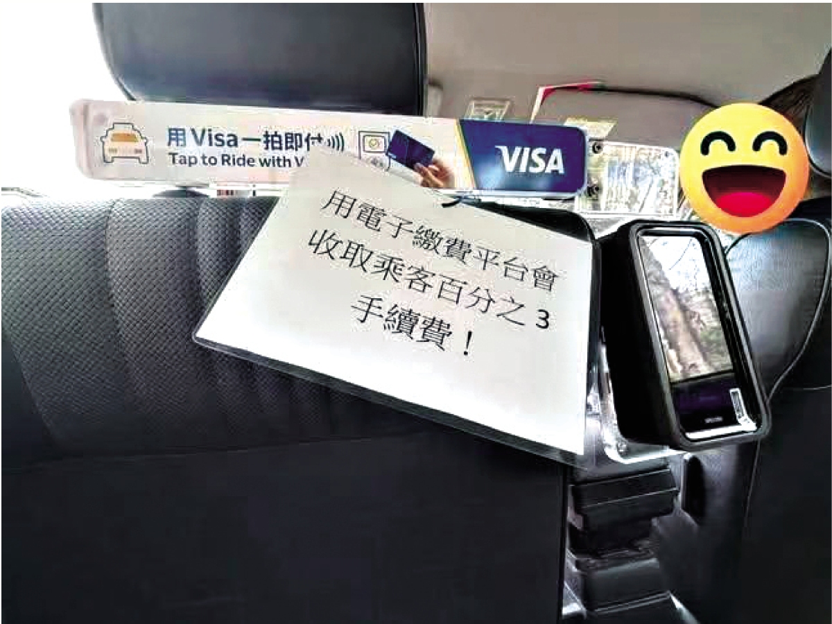有網民昨日在社交平台發帖,相片顯示的士前排椅背展示告示稱,「用電子繳費平台會收取乘客3%手續費!」引起網民熱議是否涉及濫收車資。有人留言稱,有關的士安裝了DASH咪錶連接電子支付系統,該系統向乘客徵收3%手續費。