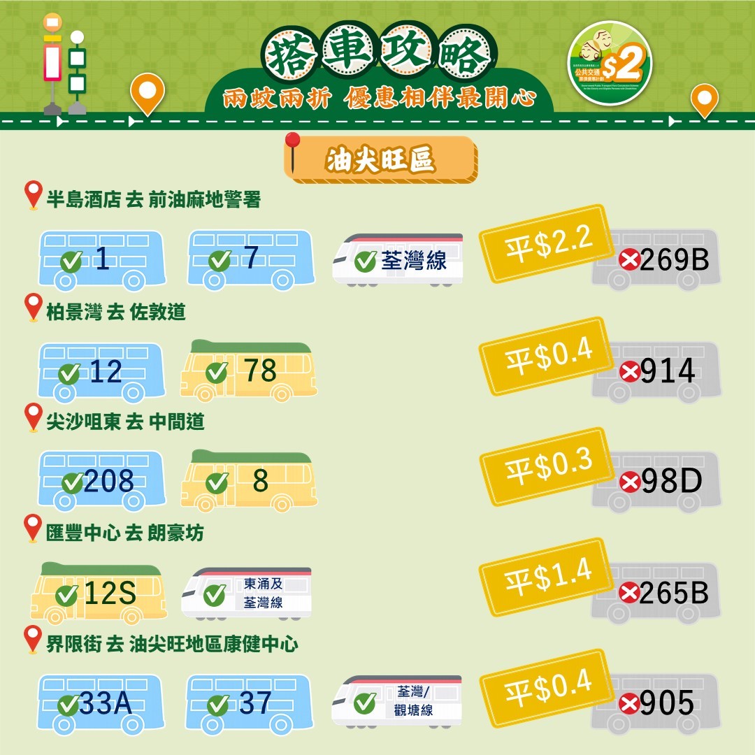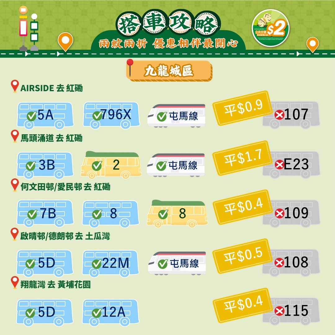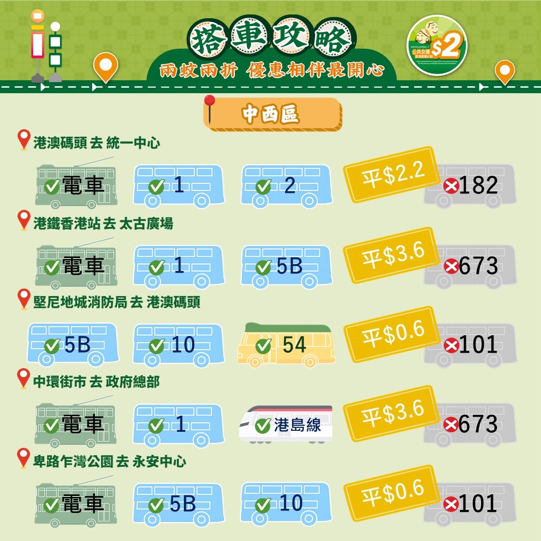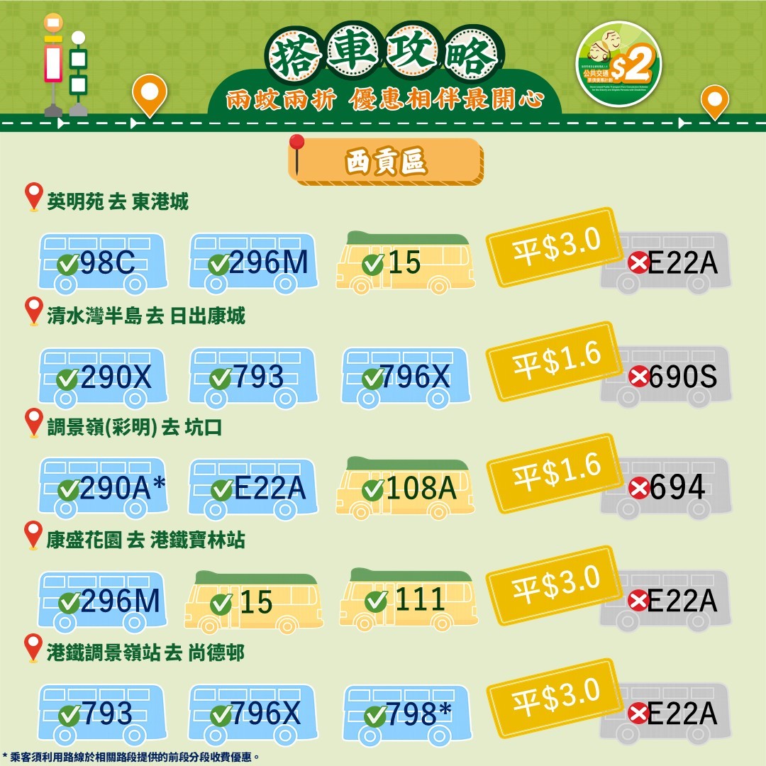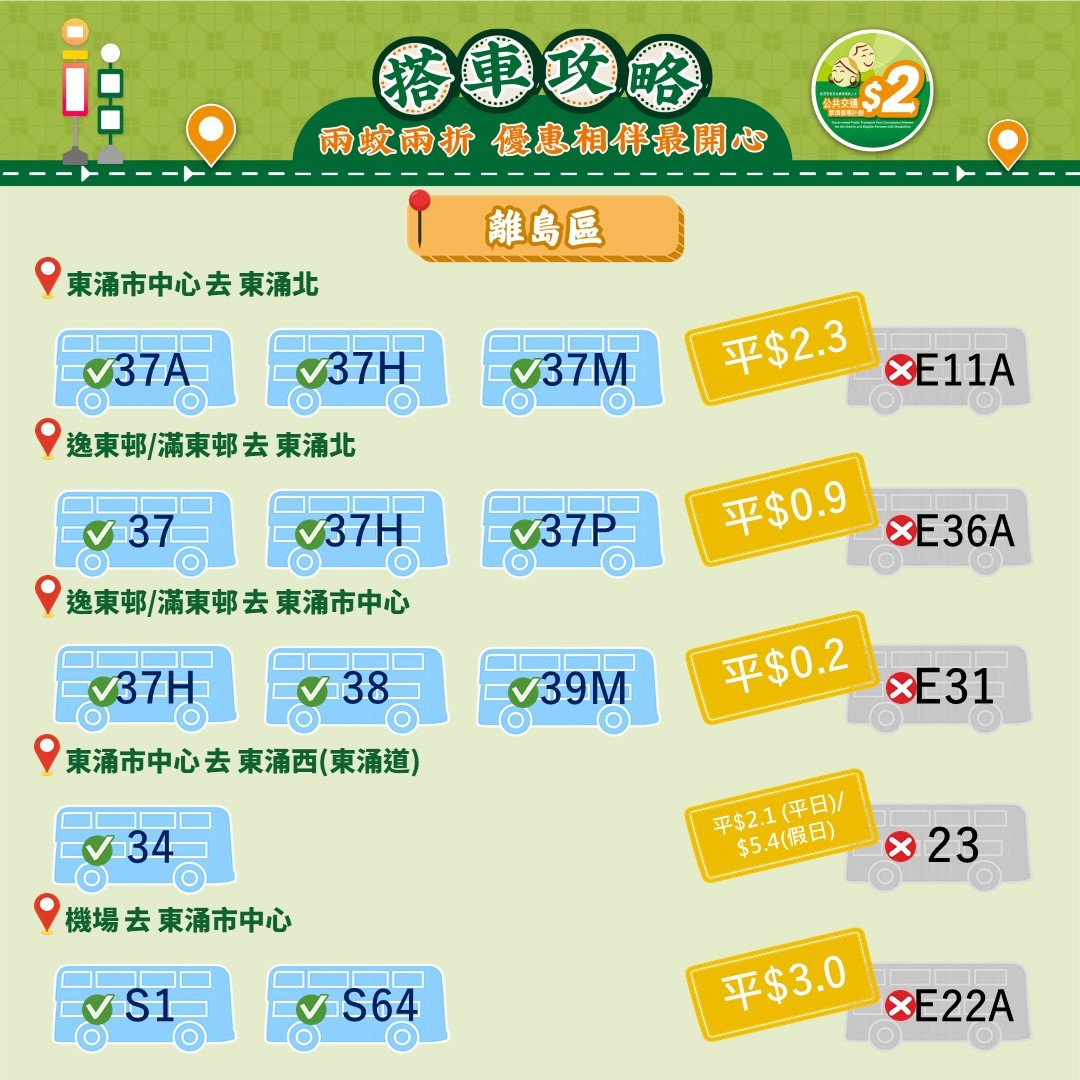 此外,運輸署還推出乘車懶人包,教受惠人士以最便宜的方法乘搭區內交通工具。其中由東涌市中心來往東涌西一程可節省5.4元。如果乘搭新大嶼山23號巴士,假日全程車資達37元,「兩蚊兩折」後需付7.4元。如果改乘34號巴士,車資僅5.1元,長者實付2元。