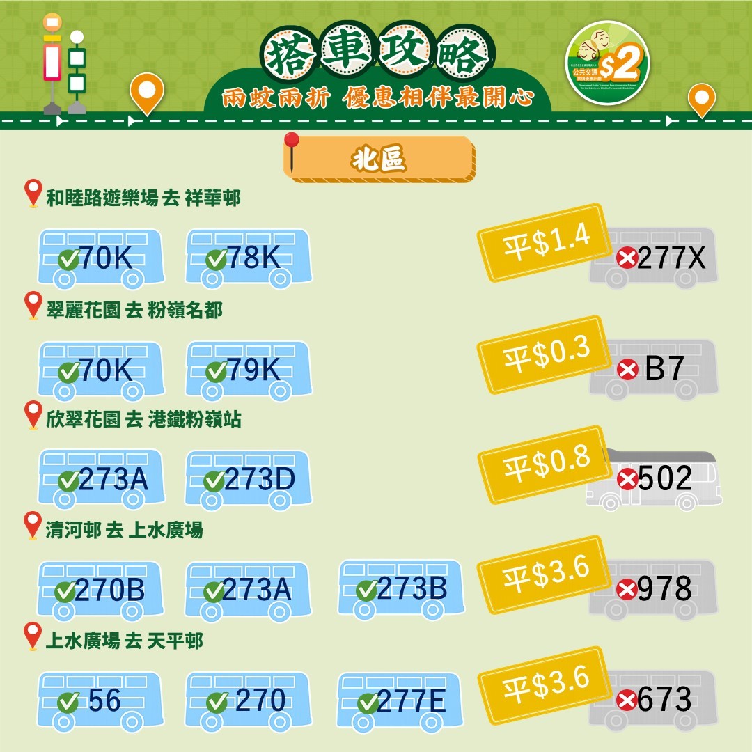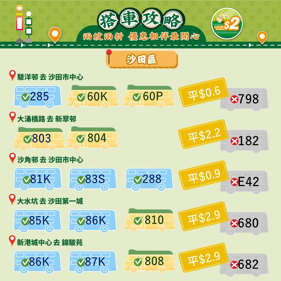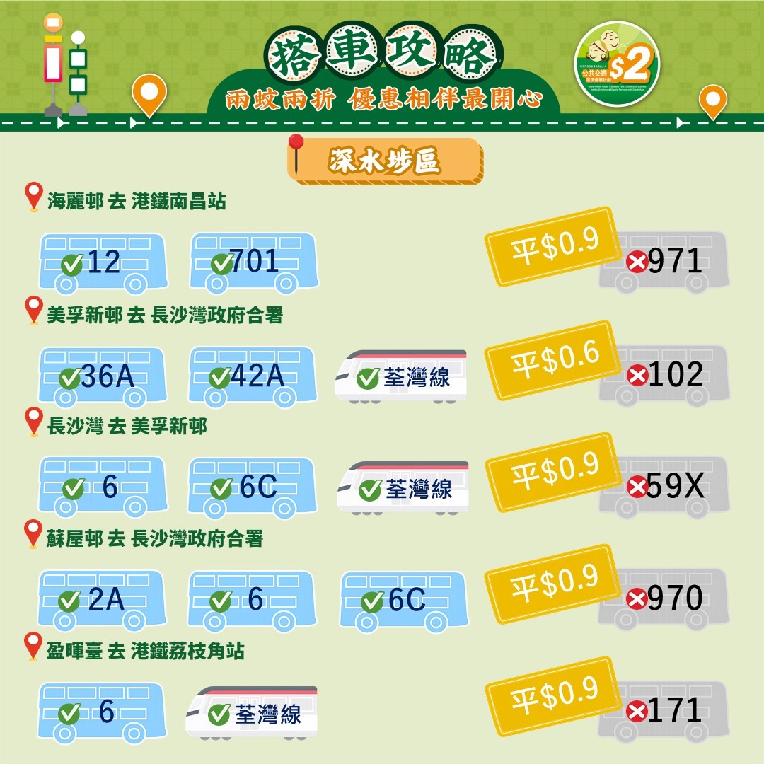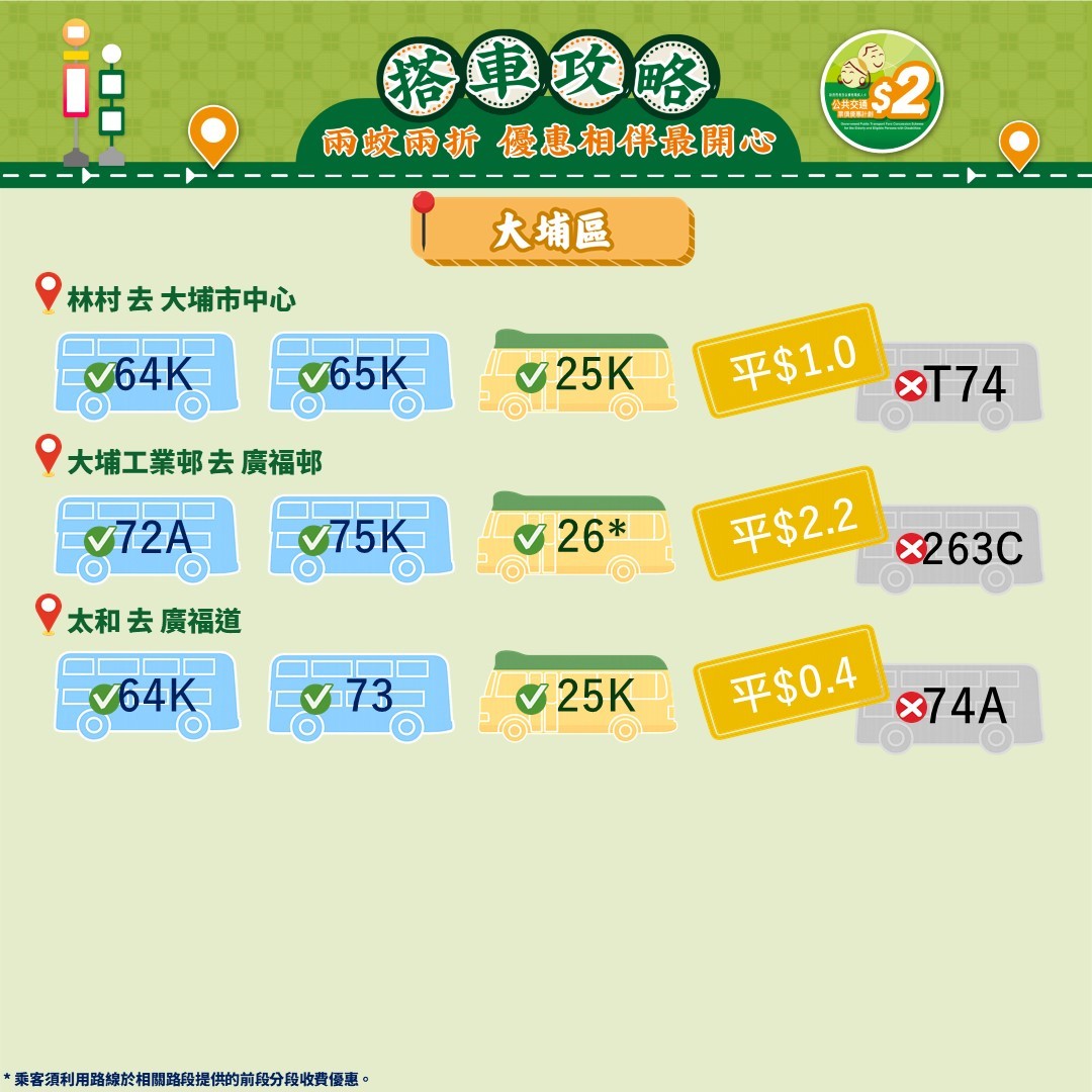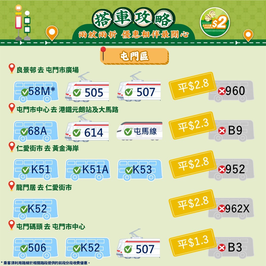 此外,運輸署還推出乘車懶人包,教受惠人士以最便宜的方法乘搭區內交通工具。其中由東涌市中心來往東涌西一程可節省5.4元。如果乘搭新大嶼山23號巴士,假日全程車資達37元,「兩蚊兩折」後需付7.4元。如果改乘34號巴士,車資僅5.1元,長者實付2元。
