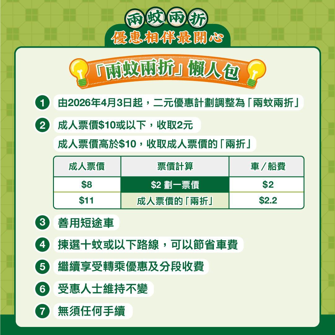 【點新聞報道】「2元乘車優惠計劃」明日(4月3日)起調整為「兩蚊兩折」。財政預算案提出,60歲或以上長者享2元優惠的門檻不變,10元以下車資繼續收2元,車資10元以上則按原價兩折計算。至於每月限搭240程的方案則料於2027年4月實施。