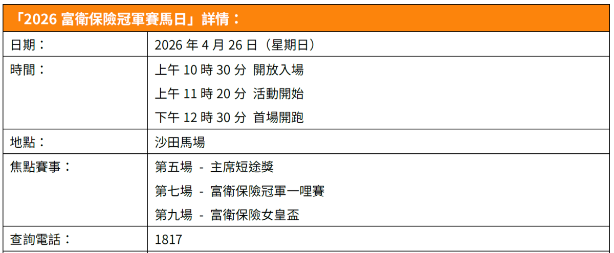 【點新聞報道】一年一度的國際馬壇春季盛事「富衛保險冠軍賽馬日」將於4月26日在沙田馬場隆重舉行。作為最具代表性的國際賽馬盛會之一,「富衛保險冠軍賽馬日」不僅是世界頂級賽駒爭逐殊榮的舞台,更是香港展現國際體育娛樂魅力的重要平台,每年均吸引大批本地市民以至內地及海外旅客齊聚沙田馬場,體驗香港獨有的賽馬文化。
