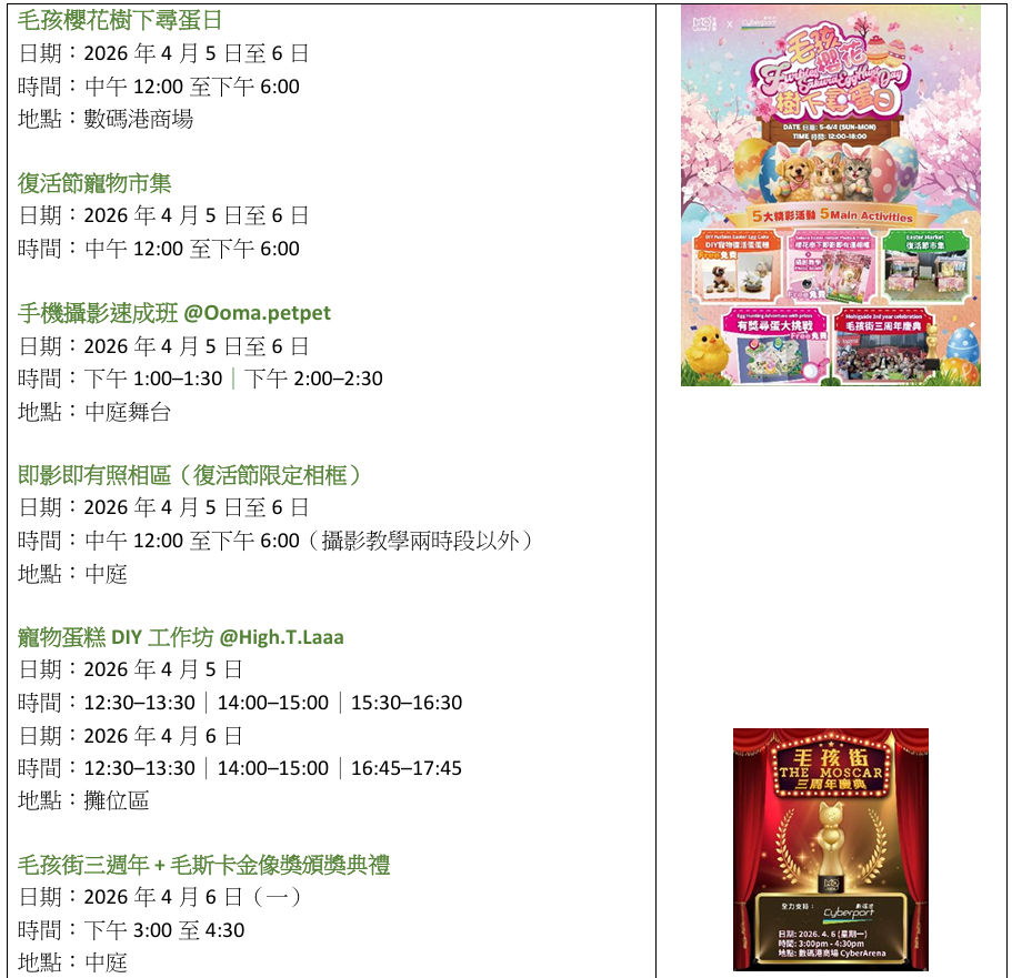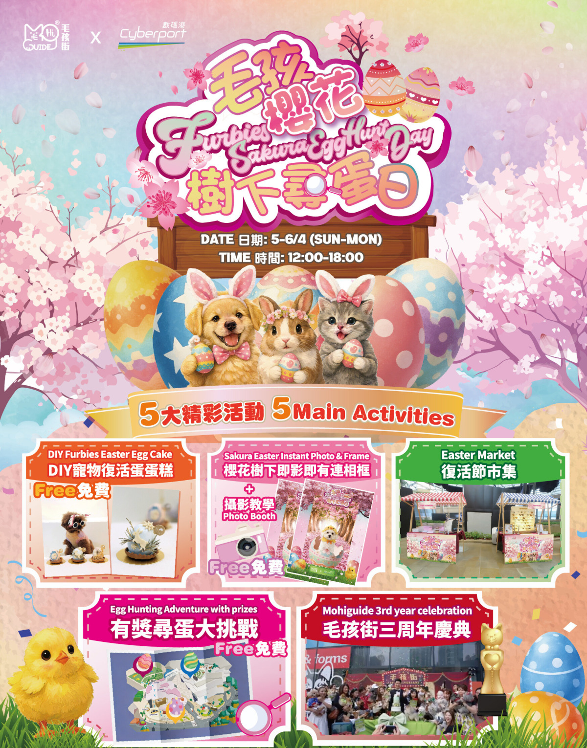 【點新聞報道】今個復活節,數碼港將聯同本地寵物社群平台「毛孩街」,於4月5日至6日一連兩日舉辦「毛孩櫻花樹下尋蛋日」(Furbies Sakura Egg Hunt Day)。活動以春日櫻花為靈感,結合沉浸式春日場景、互動遊戲、攝影教學、寵物市集及工作坊,將數碼港商場打造成夢幻日系寵物樂園,場內設有大型櫻花樹打卡區及櫻花飄落特效裝置。