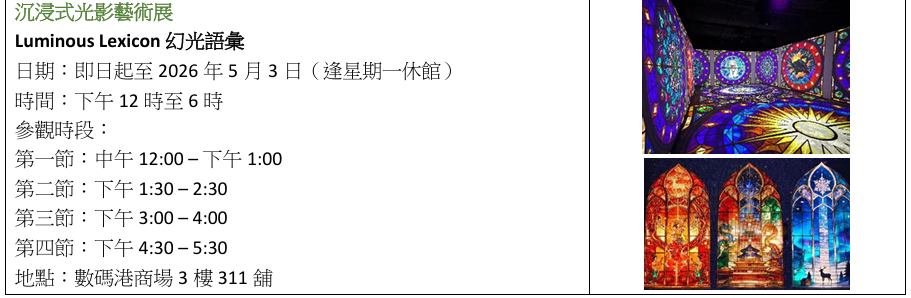 與此同時,數碼港商場三樓311號舖正舉行由當代文化科技美術館(AMCCT)策展的特別展覽《Luminous Lexicon 幻光語彙》——光影與符號沉浸互動藝術展,展期至2026年5月3日。展覽以數世紀的彩繪玻璃工藝為創作脈絡,透過五個核心展區,融合沉浸式數位投影與互動光影技術,帶領觀眾走進東西方符號深層對話的光影旅程。