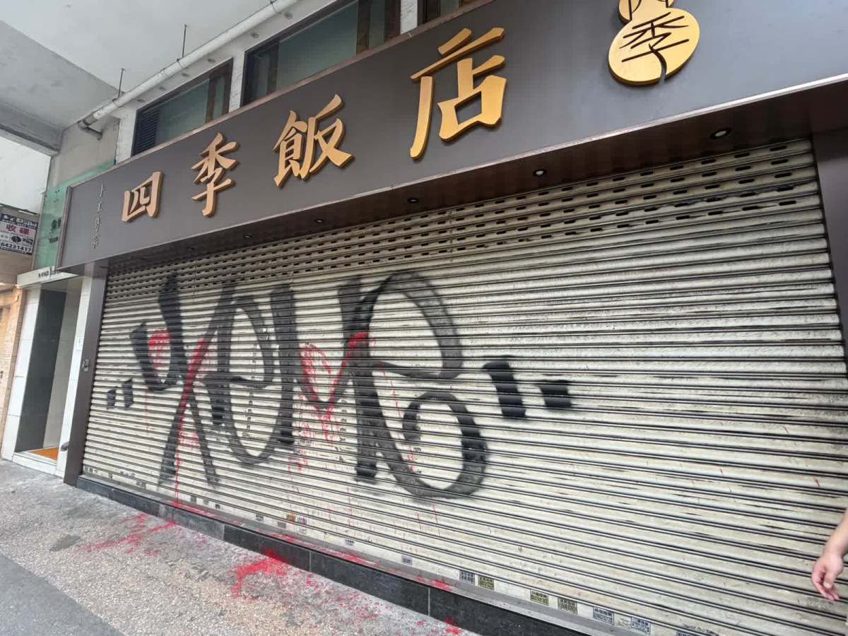 今早約10時31分,警方首先接獲謝斐道414號地下一間火鍋店的職員報案,指準備開門營業時,發現大門被潑淋紅色油漆,櫥窗玻璃亦被染紅。相隔不到1小時至上午11時18分,警方再接獲勿地臣街10號一間麵館的職員報案,指發現大門捲閘遭人潑淋紅色油漆,地上亦沾染紅漆。
