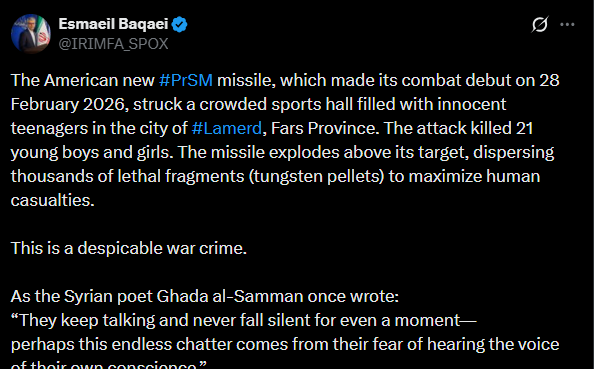 【點新聞報道】當地時間4月2日,伊朗外交部發言人巴加埃在個人社交媒體平台上發布消息,在談及美國於2月28日在伊朗法爾斯省拉默爾德市體育館發動的襲擊時稱,該襲擊使用了新型彈道導彈,導致21名青少年運動員遇難。