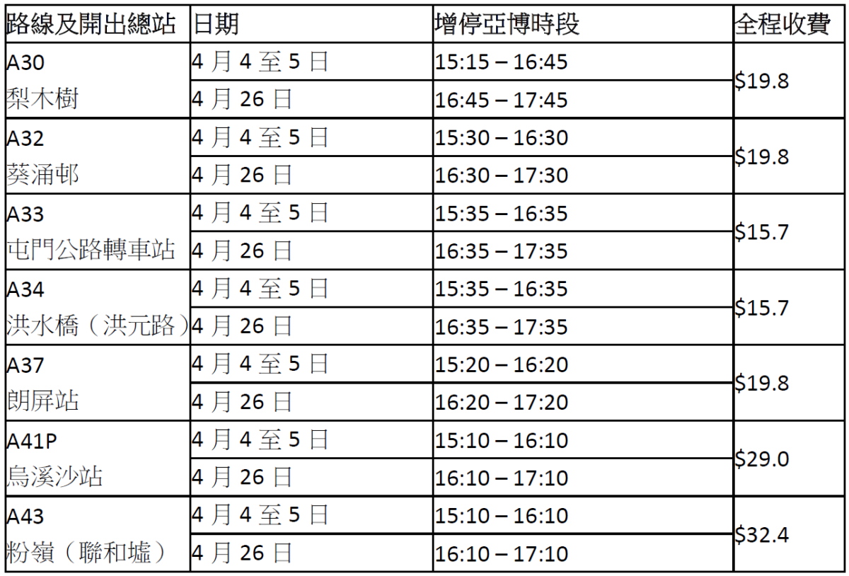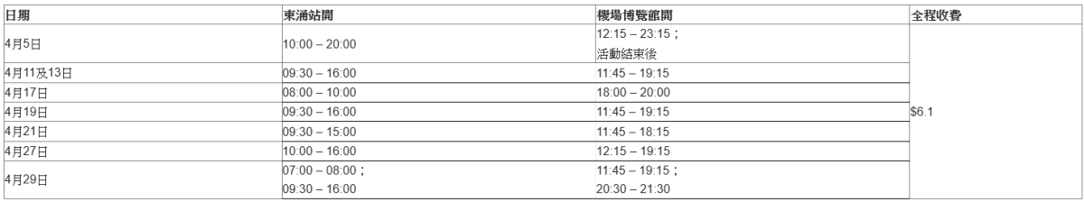 此外,為配合音樂會及其他亞博活動,龍運將於4月5、11、13、17、19、21、27及29日提供特快巴士路線X1[東涌站⇋機場博覽館]直接來往東涌站與亞博,不設中途站。