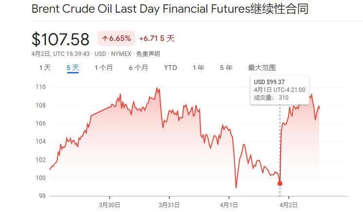以6月交割的布倫特原油期貨價格為例,在美東時間4月1日21時特朗普開始發表電視講話後的一個小時內,該價格從99.37美元/桶飆升至105.97美元/桶,一個小時內的漲幅就達到6.64%。5月交割的美國西得克薩斯輕質原油(WTI)期貨價格也在該時間段內從97.9美元/桶升至104.12美元/桶,漲幅達6.35%。截至2日收盤時,5月交割的美國西得克薩斯輕質原油(WTI)期貨價格已升至111.54美元/桶,單日漲幅達11.42%。