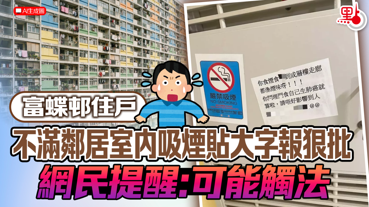 【點新聞報道】近日網絡上流傳一張照片,顯示大埔富蝶邨有公屋住戶因不滿鄰居在室內吸煙導致煙味蔓延至走廊,貼大字報狠批對方。不過,有網民指出該行為可能觸法。
