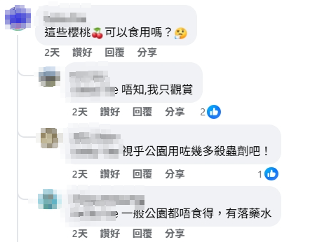 然而,最令一眾網民好奇的,莫過於「這些櫻桃可不可以食用?」對此,樓主回應稱「唔知,我只觀賞」,亦有其他網民提醒:「一般公園嘅果實都唔食得,有落藥水」、「呢個係苦櫻桃,不可以食用。」呼籲市民眼看手勿動,切勿採摘。
