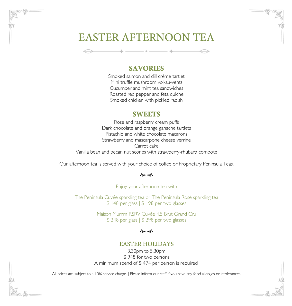 復活節早午餐將帶來豐盛的美食體驗,更有復活節兔子驚喜現身。賓客可細味豐富的海鮮盛宴、即席烹調美食,以及主菜選擇如羊肩肉卷,並享用主題節日甜品吧。此外,復活節下午茶為您於穿梭市集與工作坊之間提供完美的歇息時刻。
