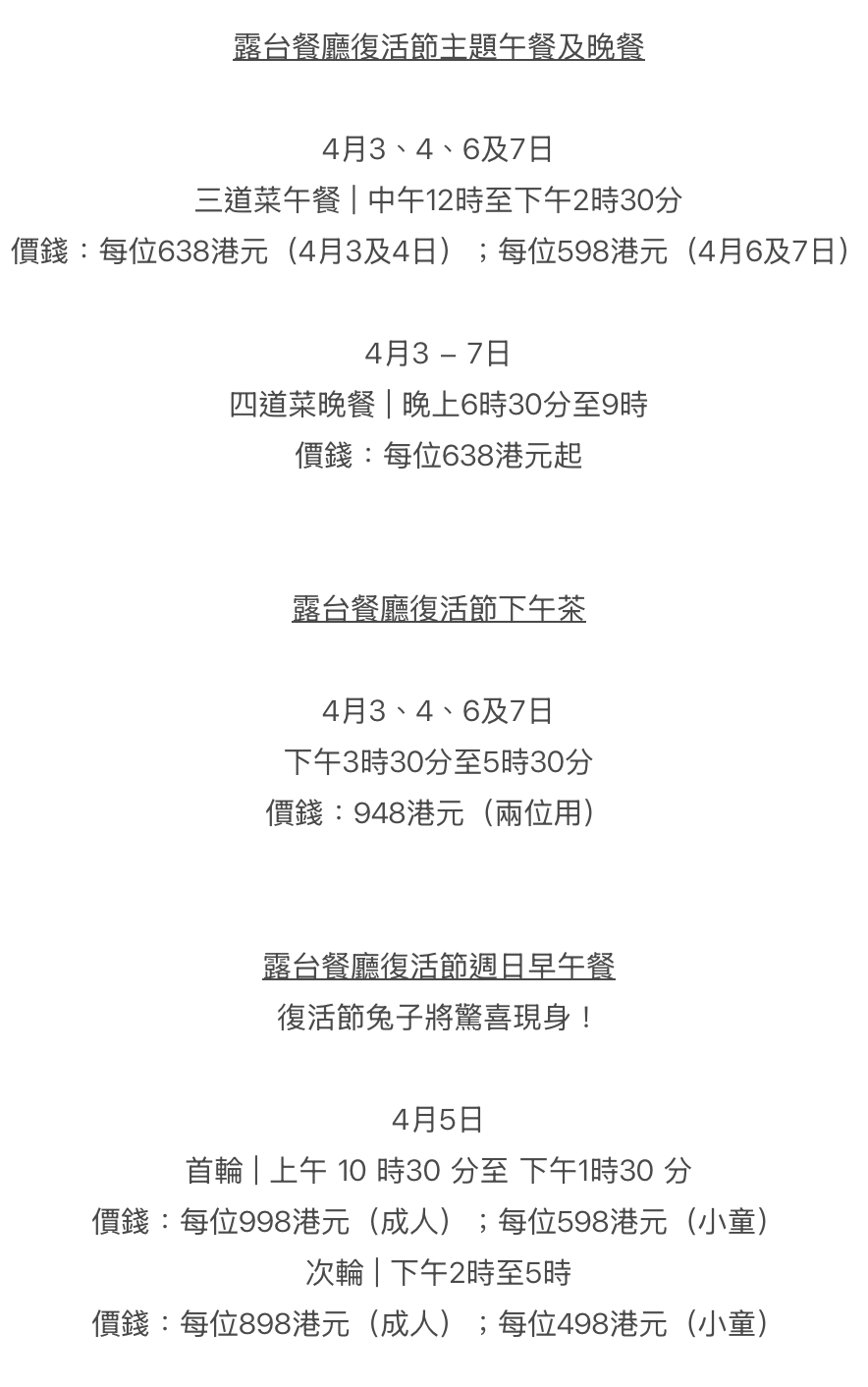 至於復活節午市及晚市套餐,則以經典應節的菜式令人垂涎:前菜包括可愛美味的魔鬼蛋、清新的煙三文魚及三文魚籽沙律;主菜如羊肩肉卷配迷迭香羊肉汁。此外,深受歡迎的節日傳統十字包亦於今季載譽歸來,為餐桌增添節慶喜悅。