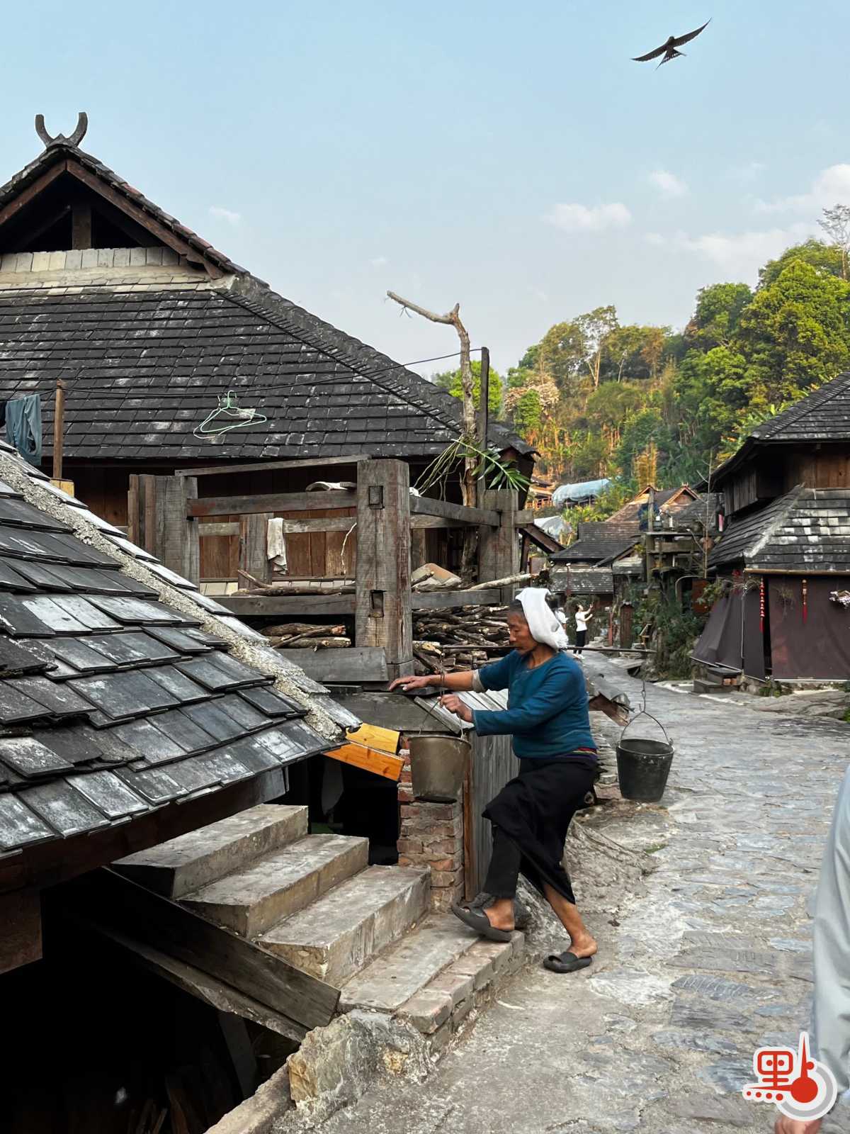 而在另一邊的糯乾古寨,屋頂上裝飾的則是牛角,寓意着長壽與力量。這些寨子雖然都有上千年的歷史,但眼前大部分木屋,其實是近二十年內重建的。聽說火災幾乎是每個寨子都有的記憶,大火過後,整片木屋燒成灰,人們又在廢墟上重建家園。於是現在,每個寨子裏都有專門敲鑼的人,提醒大家「小心火燭」。