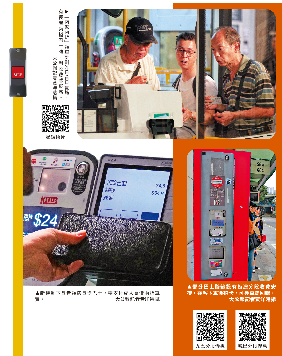 特區政府的「兩蚊兩折」乘車計劃昨日首日實施,涉及全港大約267萬人,絕大多數是長者。大公報記者昨日走訪多區乘搭不同巴士路線,發現長者「長車短搭」的情況有改善。九巴、城巴部分路線設有短途分段收費安排,乘客落車拍卡可獲車費回贈,記者在巴士站現場觀察,大約半數長者乘客有拍卡,有長者「長車短搭」落車主動拍卡領取回贈。
