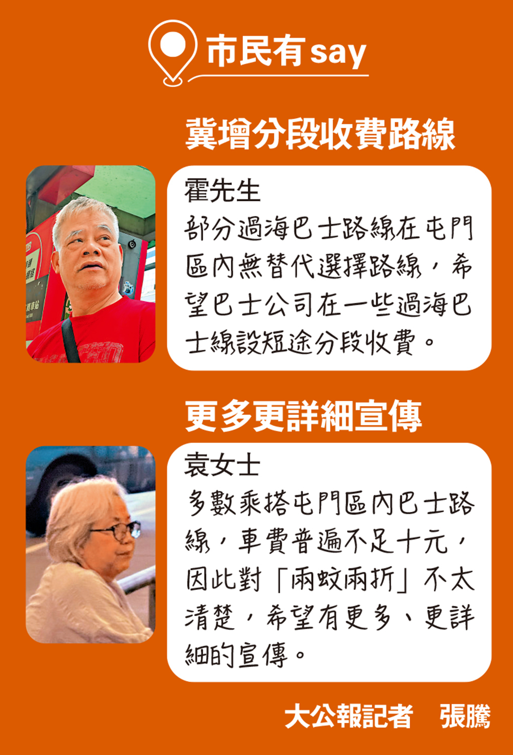 大公報記者於上月尾趁「兩蚊兩折」實施前,在九龍區試乘171、970X及971三條過海隧巴路線,其間錄得10名長者「長車短搭」。記者昨日再乘搭該三條路線,發現僅有一名長者於深水埗楓樹街登上171路線巴士,然後只搭兩個車站到聯合廣場便下車。在旺角等候巴士的市民李先生說,曾見過長者「長車短搭」,贊成「兩蚊兩折」措施,令資源更好運用。